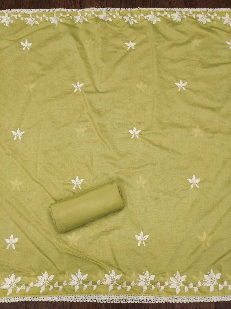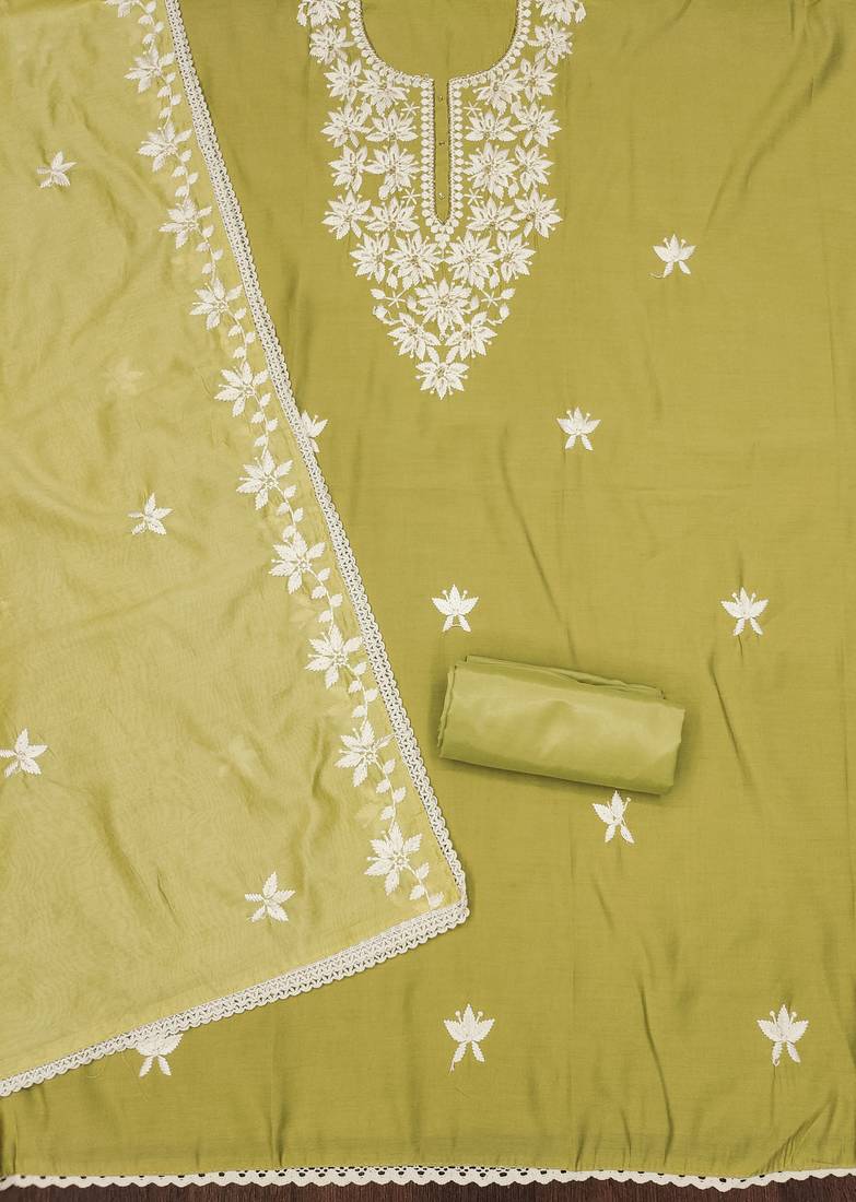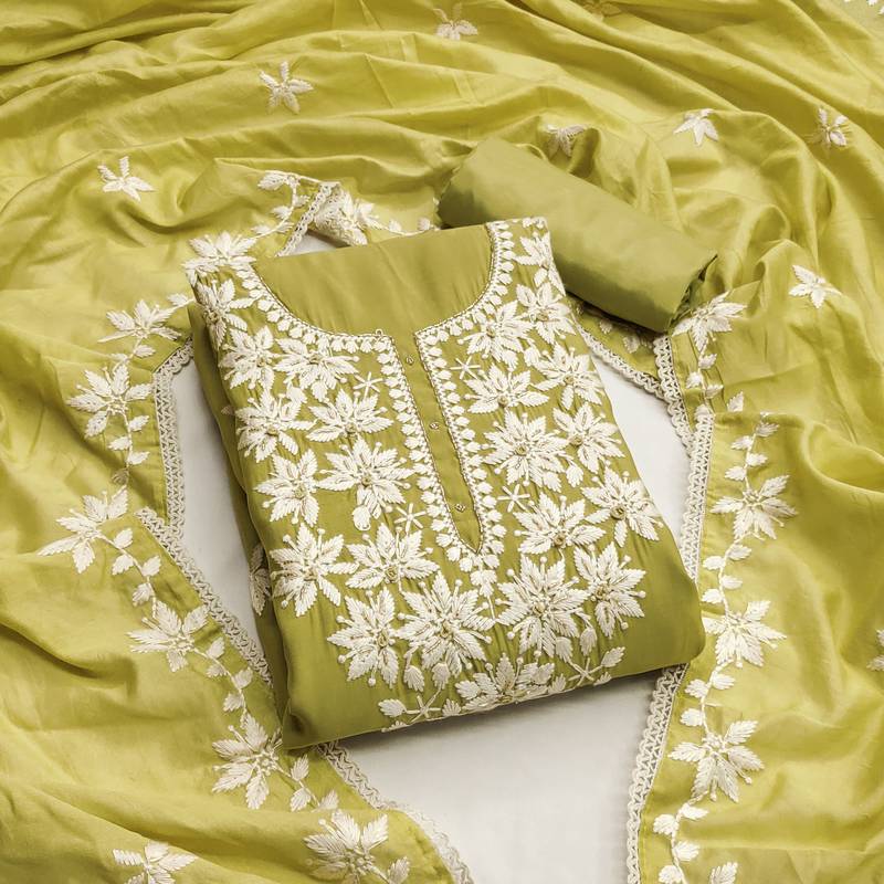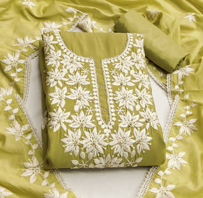 Lime color thread work roman silk straight churidar dress material semi stitched