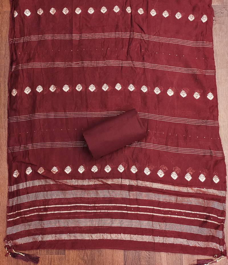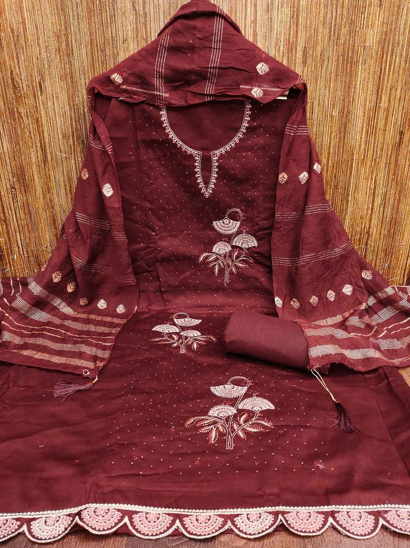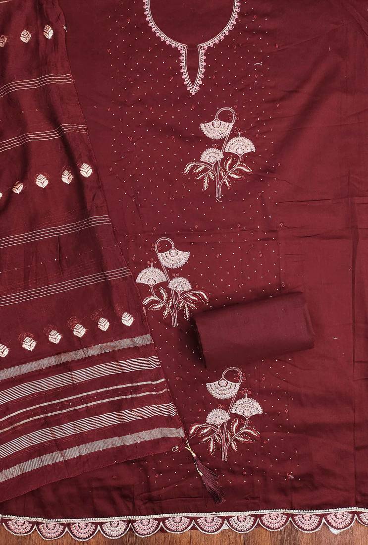 | Product Description | Ready To Ship Heavy Thread Daimond Embroidery And Fancy Border With Designer Weaving Dupatta Straight Style 2.00 Mtr Unstitched Dress Material Top Of Maroon Colour Jaam Cotton Fabric Also Including 2.00 Mtr Chudidar Style Bottom Piece Material Of Maroon Colour Cotton Fabric With 2.00 Mtr Dupatta Of Maroon Colour Chanderi Cotton Fabric By Shadow & Saining Brand |