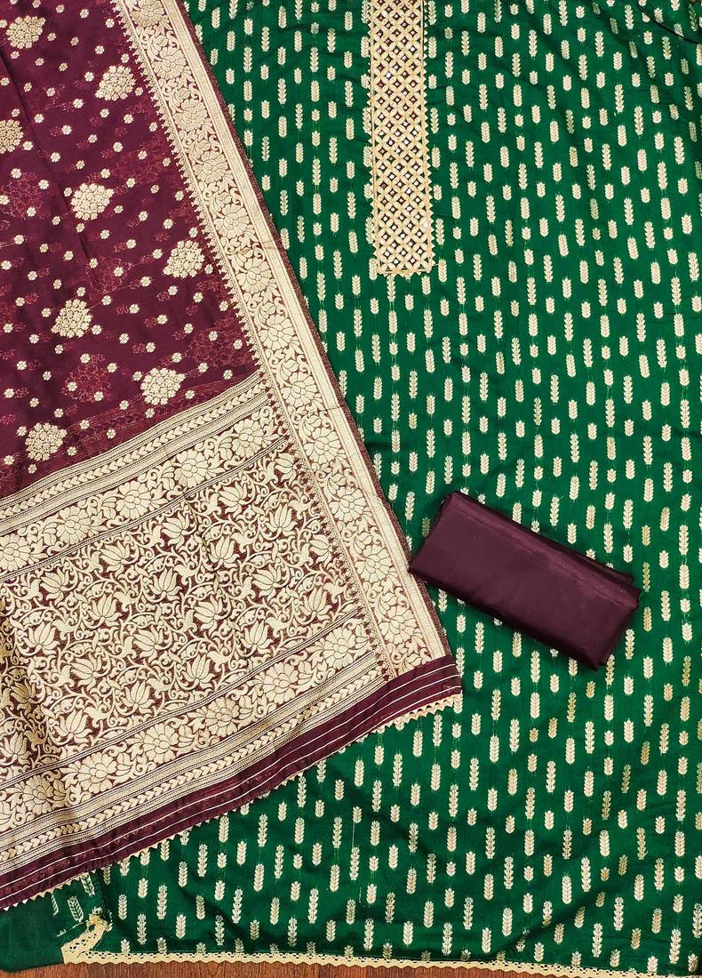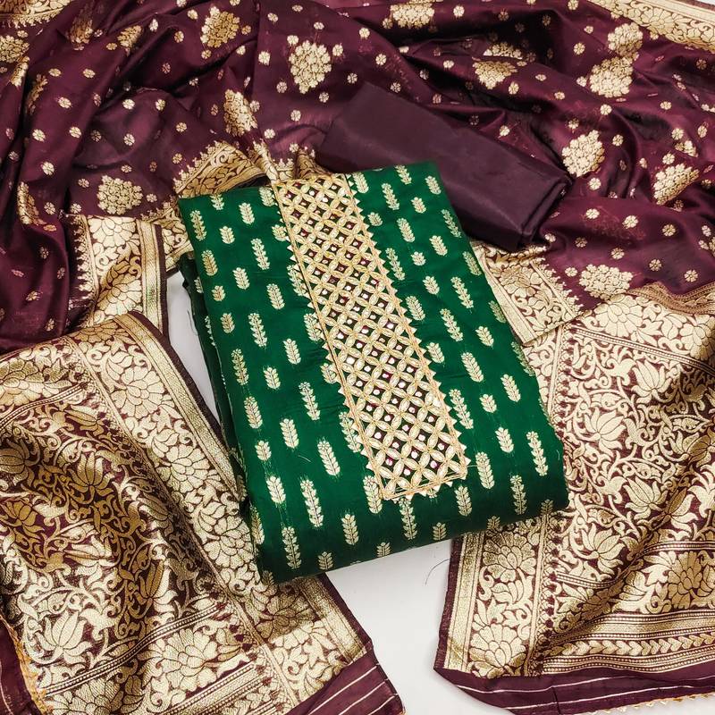 | Product Description | Exclusive Designer Jari Weaving Work With Fancy Neck Work And Fancy Jari Weaving Work Dupatta Straight Style 1.90 Mtr Unstitched Dress Material Top Of Mehandi Green Colour Banarasi Jacquard Fabric With 2 Mtr Heavy Santoon As Lining Inner Fabric Also Including 4.00 Mtr Unstiched Bottom Material Of Burgundy Colour Heavy Santoon Fabric With 2.20 Mtr Dupatta Of Burgundy Colour Banarasi Jacquard Fabric By Shadow & Saining Brand |