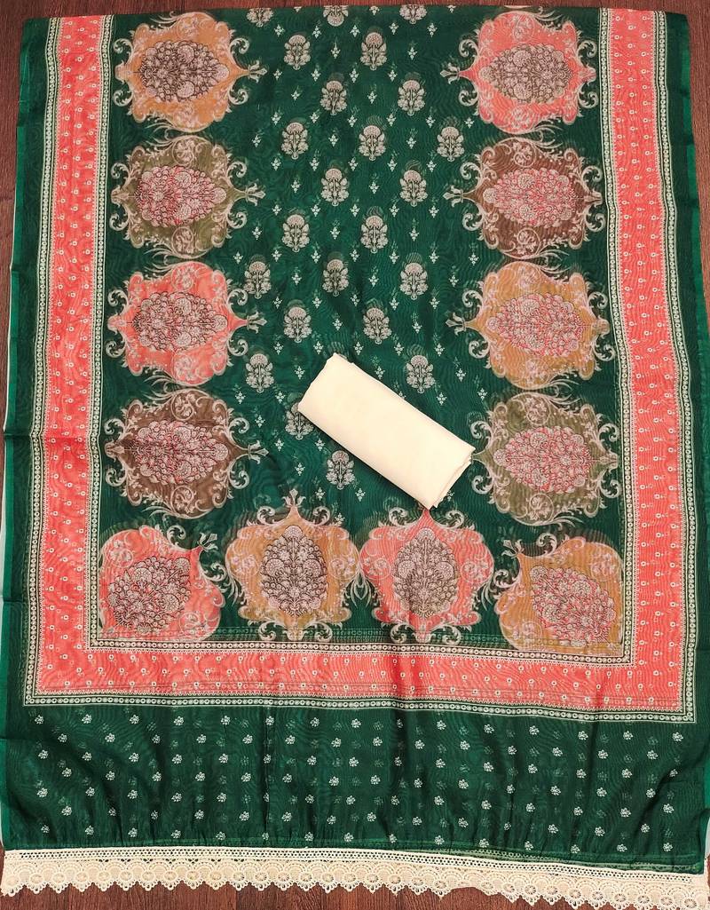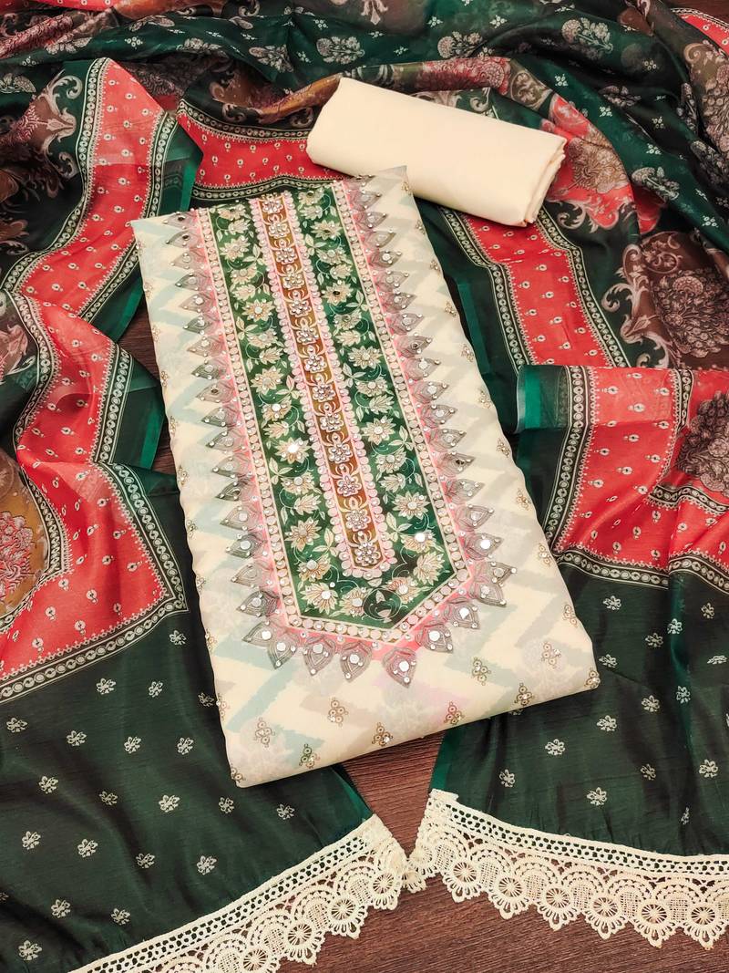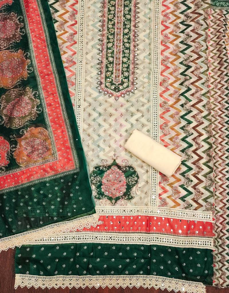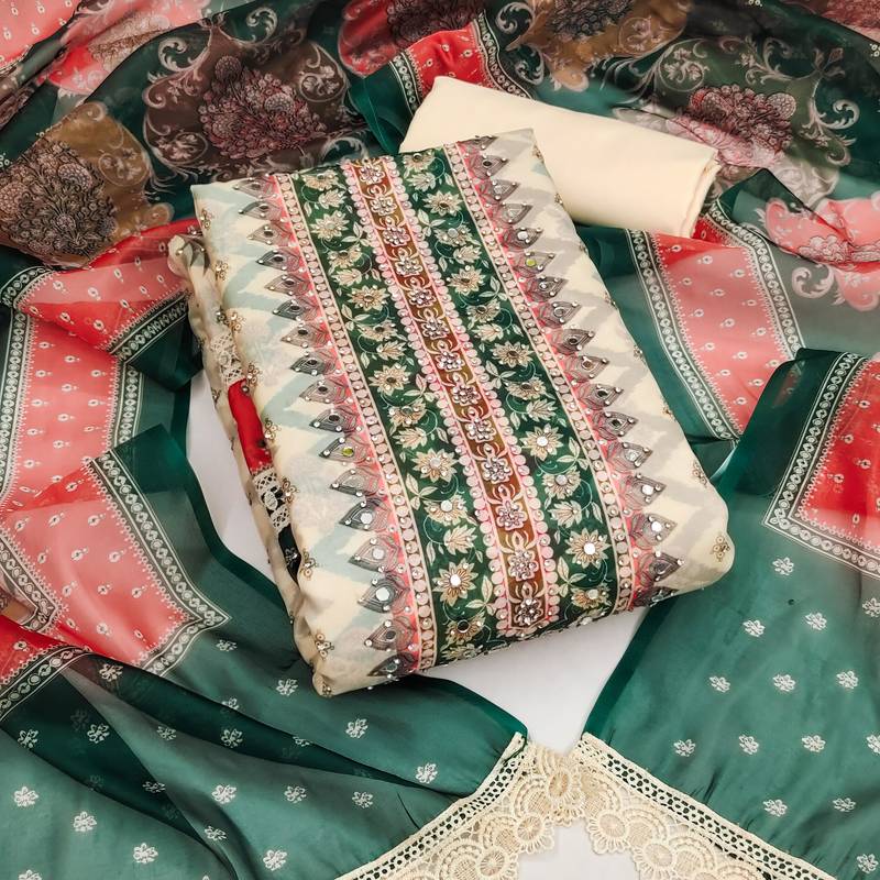 | Product Description | Dashing Stylish Mirror Daimond Work With Designer Digital Print And Thread Lace Work With Fancy Digital Print Dupatta Work Straight Style 2.20 Mtr Unstitched Dress Material Top Of Multi Colour Heavy Organza Fabric With 2 Mtr Heavy Santoon As Lining Inner Fabric Also Including 3.70 Mtr Unstiched Bottom Material Of Cream Colour Heavy Santoon Fabric With 2.25 Mtr Dupatta Of Green Colour Heavy Organza Fabric By Shadow & Saining Brand |