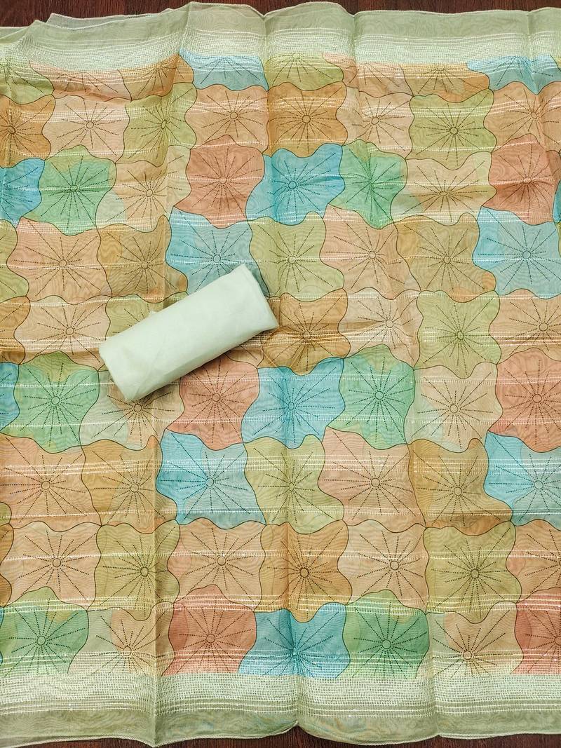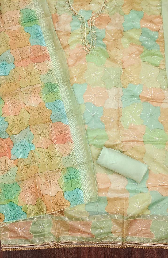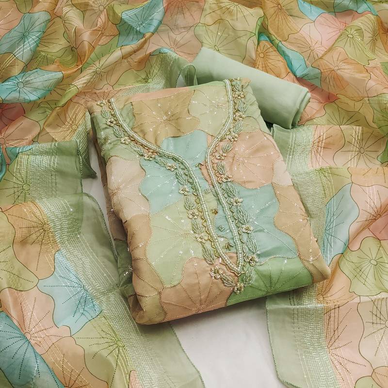 | Product Description | Simplistic Stylish Sequence Work With Designer Position Print And Hand Work With Heavy Embroidered Matching Dupatta Work Straight Style 1.90 Mtr Unstitched Dress Material Top Of Multi Colour Heavy Organja Fabric With 2 Mtr Heavy Santoon As Lining Inner Fabric Also Including 3.60 Mtr Unstiched Bottom Material Of Pista Green Colour Heavy Santoon Fabric With 2.15 Mtr Dupatta Of Multi Colour Heavy Organja Fabric By Shadow & Saining Brand |