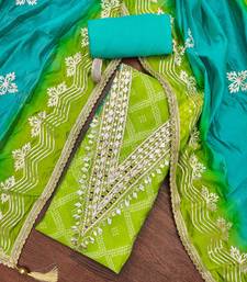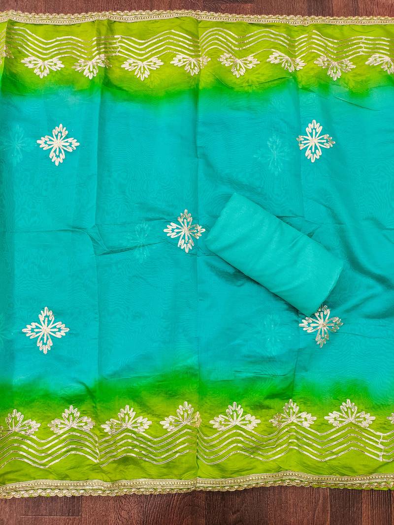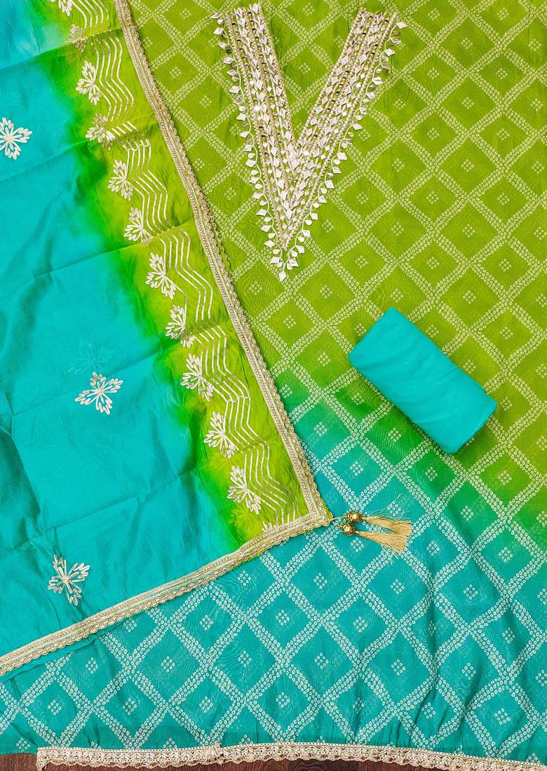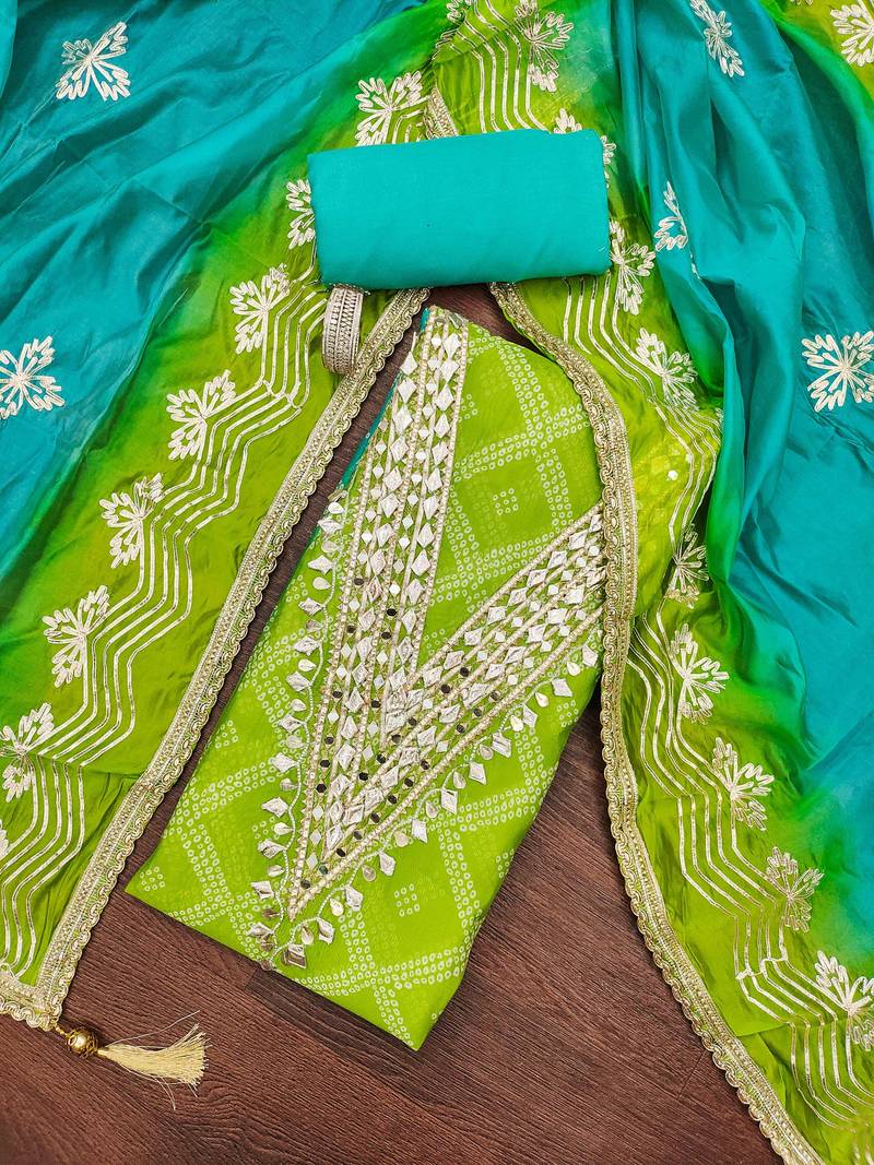 | Product Description | Stylish Bandhani Leheriya Digital Print With Heavy Gota Patti Neck Work With Border Work Along Designer Gota Pati With Digital Printed Dupatta Work Straight Style 2.40 Mtr Unstitched Dress Material Top Of Multi Colour Heavy Organza Fabric Also Including 2.50 Mtr Chudidar Style Bottom Piece Material Of Blue Colour Reyon Fabric With 2.40 Mtr Dupatta Of Multi Colour Heavy Organza Fabric By Shadow & Saining Brand |