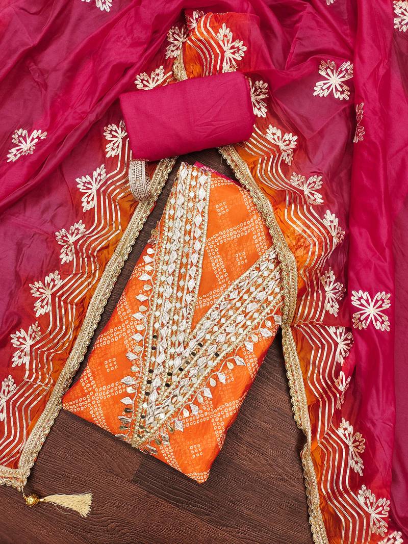 | Product Description | Stylish Bandhani Leheriya Digital Print With Heavy Gota Patti Neck Work With Border Work Along Designer Gota Pati With Digital Printed Dupatta Work Straight Style 2.40 Mtr Unstitched Dress Material Top Of Multi Colour Heavy Organza Fabric Also Including 2.50 Mtr Chudidar Style Bottom Piece Material Of Pink Colour Reyon Fabric With 2.40 Mtr Dupatta Of Multi Colour Heavy Organza Fabric By Shadow & Saining Brand |