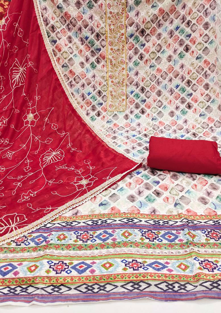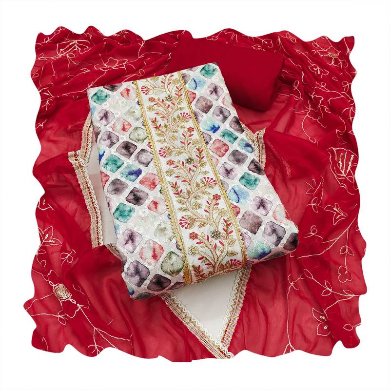 | Product Description | Office Ready Heavy Thread Embroidery Digital Print Handwork And Fancy Border With Designer Embroidered Dupatta Straight Style 2.00 Mtr Unstitched Dress Material Top Of Multi Colour Pure Cambric Cotton Fabric Also Including 2.40 Mtr Chudidar Style Bottom Piece Material Of Maroon Colour Rayon Fabric With 2.10 Mtr Dupatta Of Maroon Colour Nazneen Fabric By Shadow & Saining Brand |