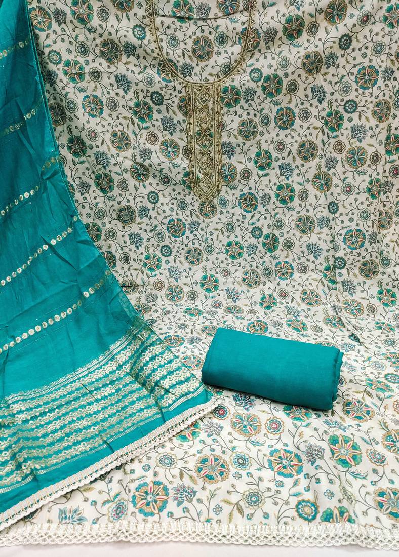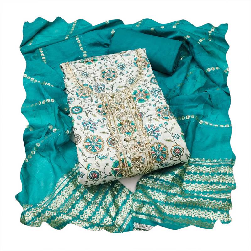 | Product Description | Luxury Designer Print Handwork Embroidery And Fancy Border With Stylish Woven Dupatta Straight Style 2.00 Mtr Unstitched Dress Material Top Of Multi Colour Roman Cotton Silk Fabric Also Including 2.40 Mtr Chudidar Style Bottom Piece Material Of Sky Blue Colour Rayon Fabric With 2.00 Mtr Dupatta Of Sky Blue Colour Chanderi Cotton Banarasi Fabric By Shadow & Saining Brand |