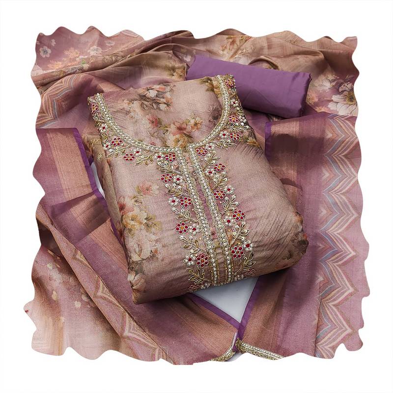 | Product Description | Curated Designer Digital Print Handwork And Fancy Border With Heavy Printed Dupatta Straight Style 2.00 Mtr Unstitched Dress Material Top Of Multi Colour Viscose Fabric Also Including 2.40 Mtr Chudidar Style Bottom Piece Material Of Purple Colour Dull Santoon Fabric With 2.10 Mtr Dupatta Of Multi Colour Soft Banarasi Fabric By Shadow & Saining Brand |