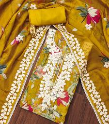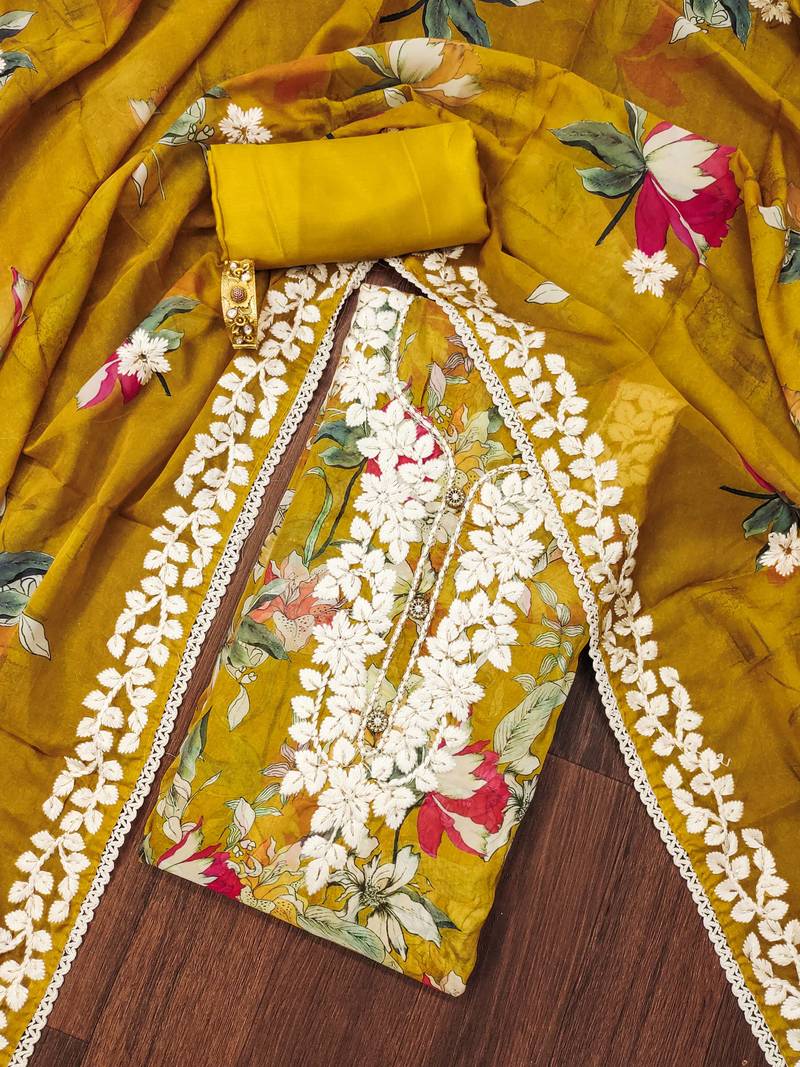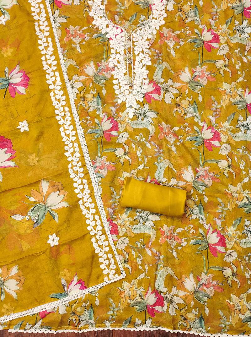 | Product Name | Mustard Embroidered Organza Semi Stitched Churidar Dress Materials | |
