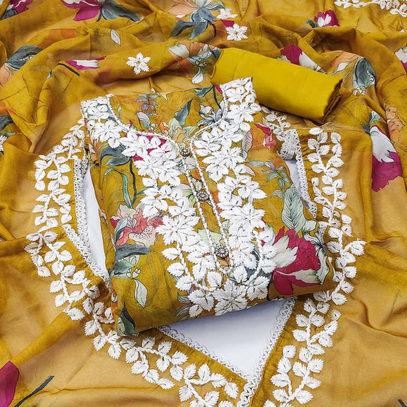 | Product Name | Mustered Color Embroidered Heavy Organza Straight Churidar Dress Material | |