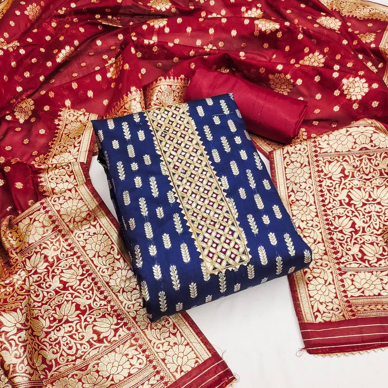 | Product Description | Appealing Designer Jari Weaving Work With Fancy Neck Work And Fancy Jari Weaving Work Dupatta Straight Style 1.90 Mtr Unstitched Dress Material Top Of Navy Blue Colour Banarasi Jacquard Fabric With 2 Mtr Heavy Santoon As Lining Inner Fabric Also Including 4.00 Mtr Unstiched Bottom Material Of Maroon Colour Heavy Santoon Fabric With 2.20 Mtr Dupatta Of Maroon Colour Banarasi Jacquard Fabric By Shadow & Saining Brand |