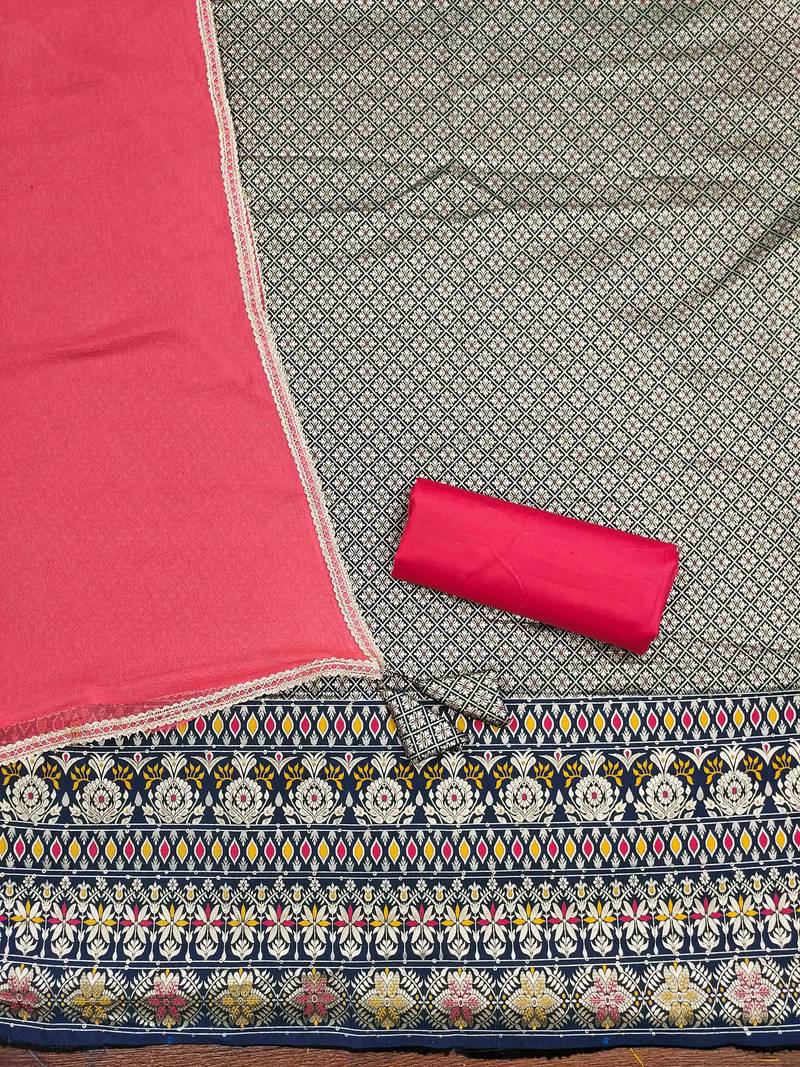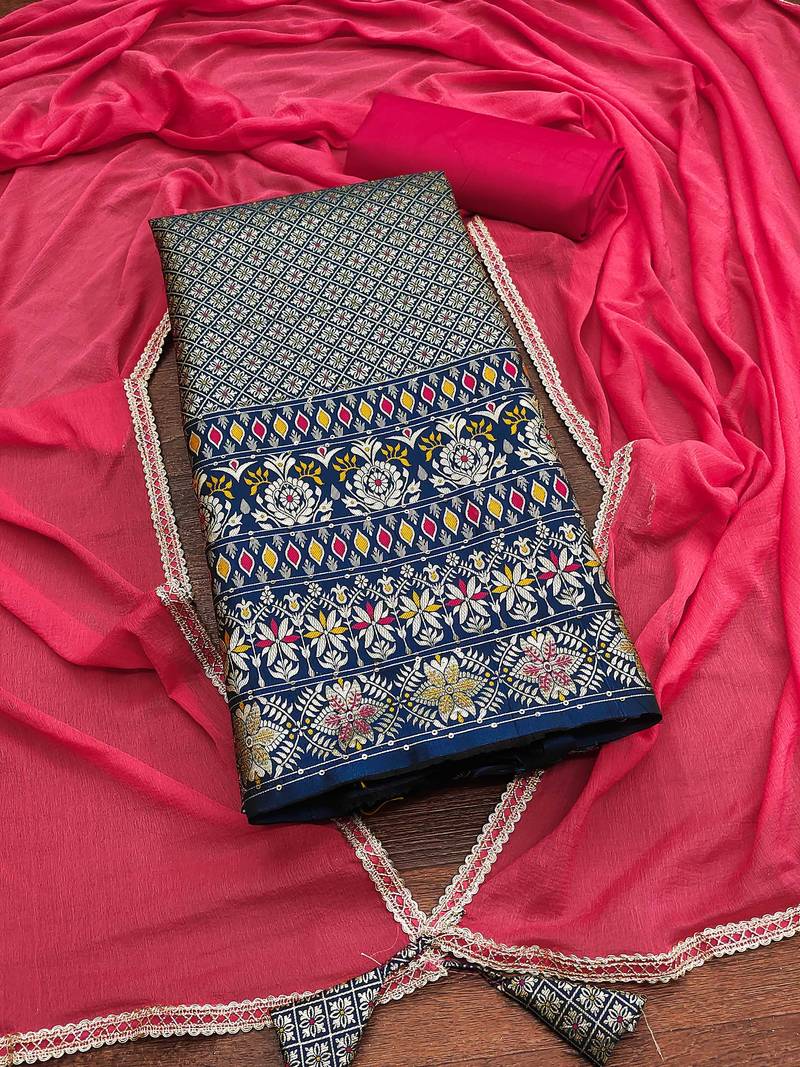 | Product Description | Exclusive Heavy Zari Weaving Work With Banarasi Jacquard Multi Mina Woven Work Along With Lace Work Dupatta Straight Style 2.00 Mtr Unstitched Dress Material Top Of Navy Blue Colour Banarasi Jacquard Fabric With 2 Mtr Silk Blend As Lining Inner Fabric Also Including 2.10 Mtr Unstiched Bottom Material Of Pink Colour Cotton Blend Fabric With 2.10 Mtr Dupatta Of Pink Colour Nazneen Fabric By Shadow & Saining Brand |