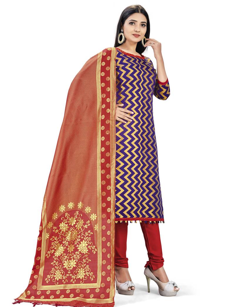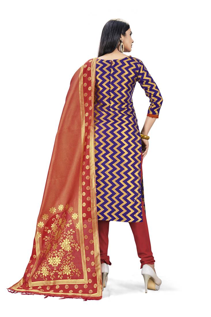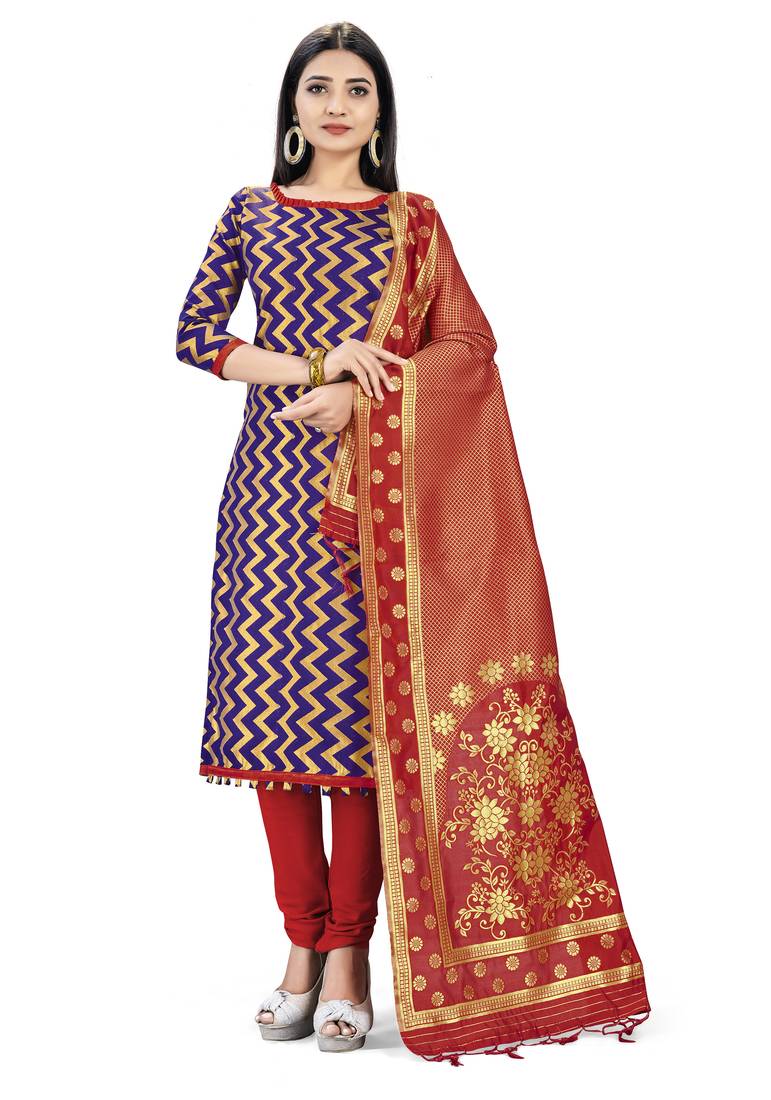 | Product Description | Awesome Heavy Designer All Over Zig Zack Pattern Weaving Work Top With Fancy Stall Dupatta Of Weaving And Jalar Work Straight Style 2 Mtr Unstitched Dress Material Top Of Navy Blue Colour Banarasi Silk Fabric Suggestable Quarter Style Sleeves And Round Style Neck Also Including 2.30 Mtr Chudidar Style Bottom Piece Material Of Red Colour Silk Blend Fabric With 2.25 Mtr Dupatta Of Red Colour Banarasi Silk Fabric By Shadow & Saining Brand |