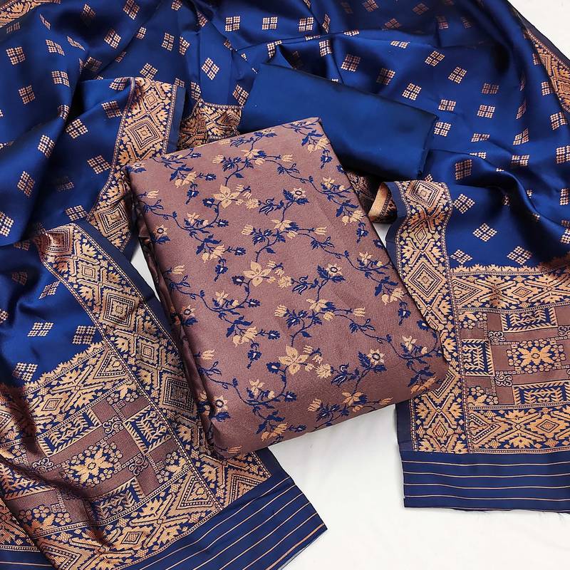 | Product Description | Stylish Heavy Weaving Work With Emboss Work And Jacquard Work Dupatta Straight Style 2.25 Mtr Unstitched Dress Material Top Of Navy Blue Colour Jacquard Silk Fabric Also Including 2.00 Mtr Chudidar Style Bottom Piece Material Of Blue Colour Tapeta Silk Fabric With 2.10 Mtr Dupatta Of Blue Colour Banarasi Jacquard Fabric By Shadow & Saining Brand |