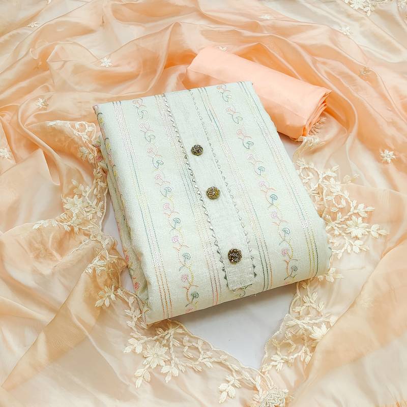 | Product Description | Fancy Heavy Multi Thread Sequence Embroidery And Print Work With Thread Work Dupatta Straight Style 2.15 Mtr Unstitched Dress Material Top Of Off White Colour Heavy Modal Chanderi Fabric With 2 Mtr Heavy Santoon As Lining Inner Fabric Also Including 4.00 Mtr Unstiched Bottom Material Of Peach Colour Heavy Santoon Fabric With 2.20 Mtr Dupatta Of Peach Colour Heavy Organja Fabric By Shadow & Saining Brand |
