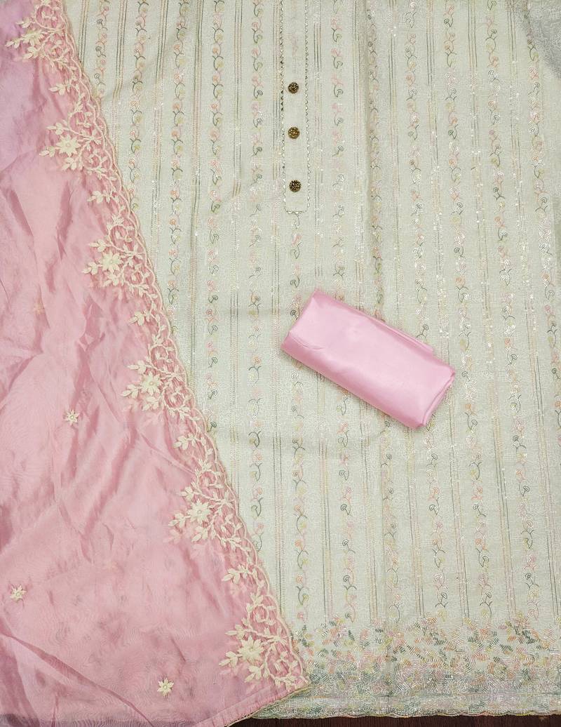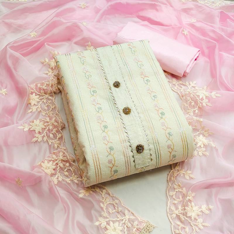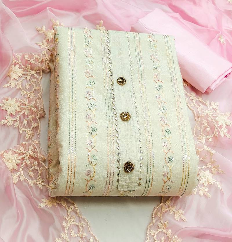 | Product Description | Exclusive Heavy Multi Thread Sequence Embroidery And Print Work With Thread Work Dupatta Straight Style 2.15 Mtr Unstitched Dress Material Top Of Off White Colour Heavy Modal Chanderi Fabric With 2 Mtr Heavy Santoon As Lining Inner Fabric Also Including 4.00 Mtr Unstiched Bottom Material Of Pink Colour Heavy Santoon Fabric With 2.20 Mtr Dupatta Of Pink Colour Heavy Organja Fabric By Shadow & Saining Brand |