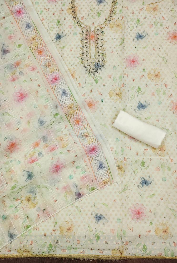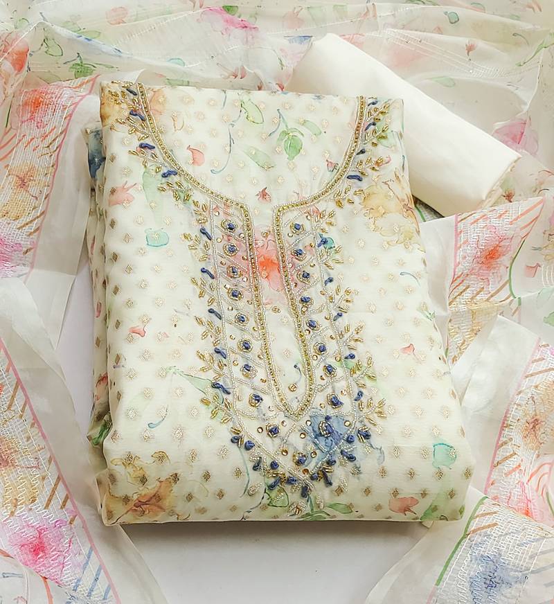 Off white color hand work banarasi jacquard straight churidar dress material semi stitched