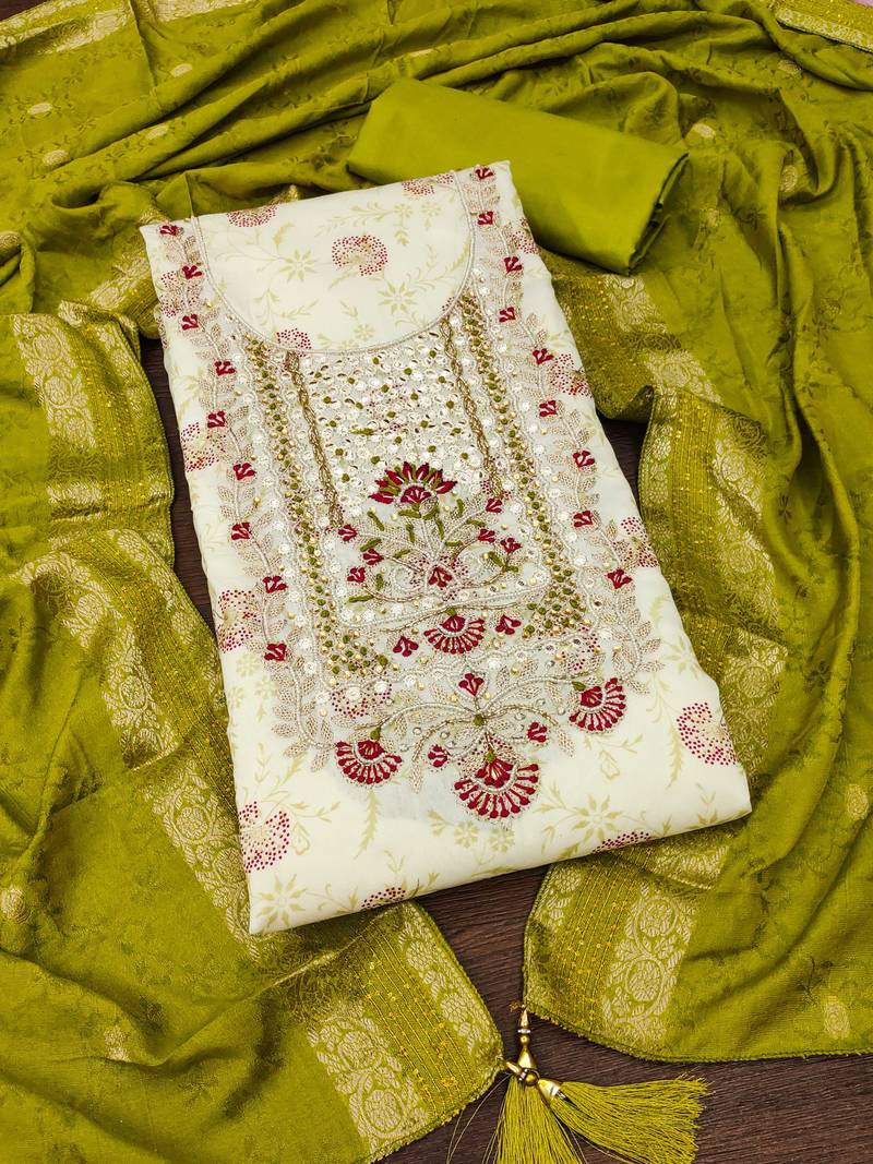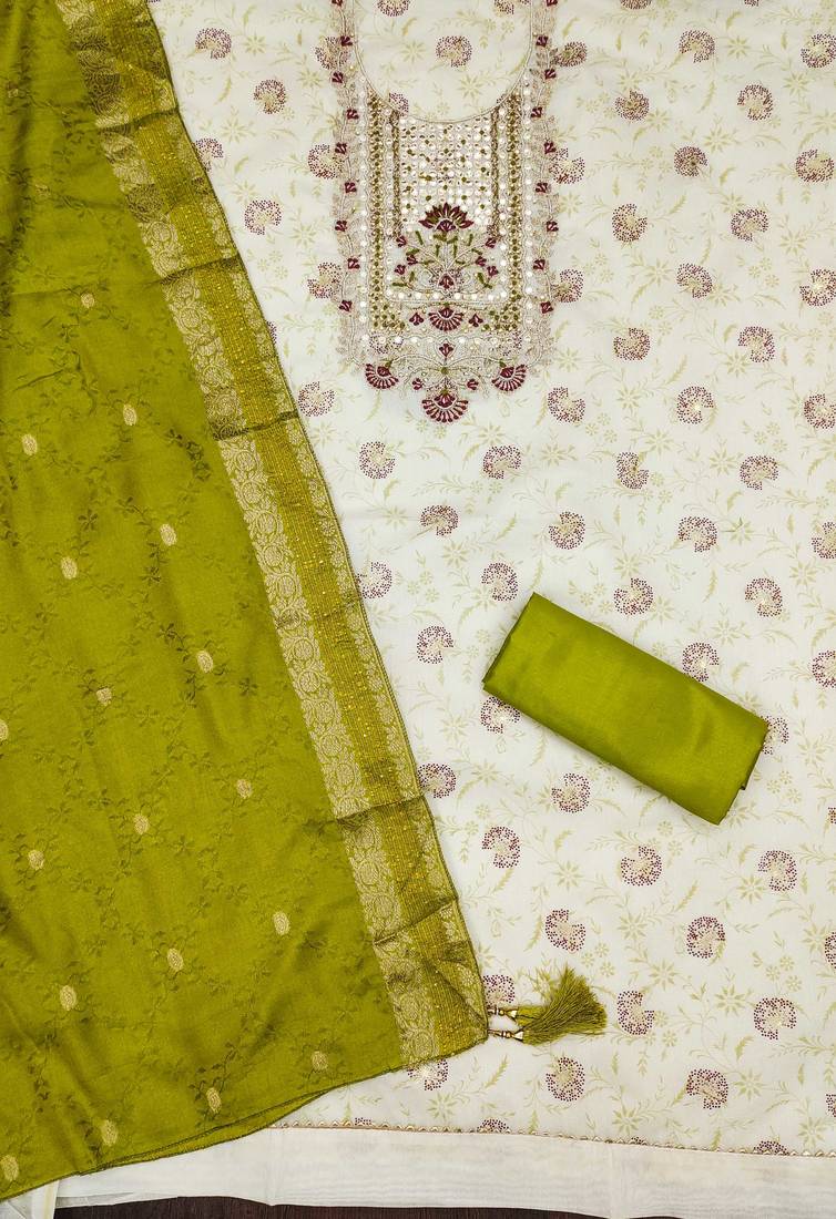 | Product Description | Exclusive Designer Weaving With Foil Work Along Embrodiery And Handwork Neck With Fancy Sequence And Weaving Work Dupatta Straight Style 1.90 Mtr Unstitched Dress Material Top Of Off White Colour Heavy Modal Chanderi Fabric With 2 Mtr Heavy Santoon As Lining Inner Fabric Also Including 4.00 Mtr Unstiched Bottom Material Of Green Colour Heavy Santoon Fabric With 2.20 Mtr Dupatta Of Green Colour Chinon Silk Fabric By Shadow & Saining Brand |
