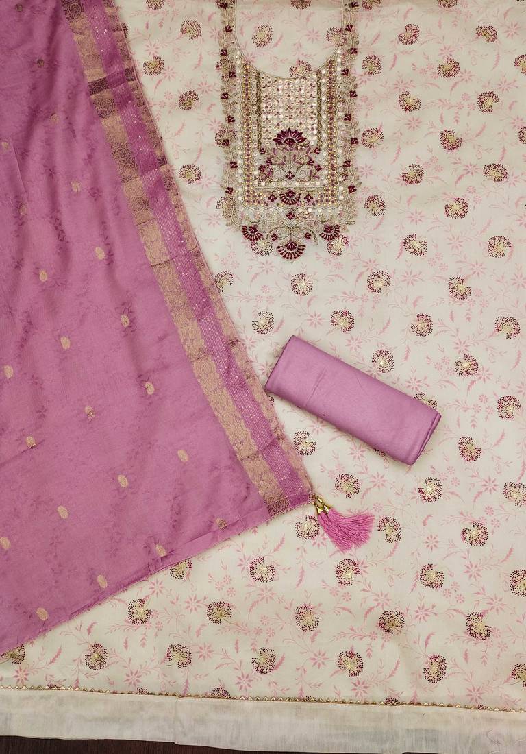 | Product Description | Designer Designer Weaving With Foil Work Along Embrodiery And Handwork Neck With Fancy Sequence And Weaving Work Dupatta Straight Style 1.90 Mtr Unstitched Dress Material Top Of Off White Colour Heavy Modal Chanderi Fabric With 2 Mtr Heavy Santoon As Lining Inner Fabric Also Including 4.00 Mtr Unstiched Bottom Material Of Pink Colour Heavy Santoon Fabric With 2.20 Mtr Dupatta Of Pink Colour Chinon Silk Fabric By Shadow & Saining Brand |