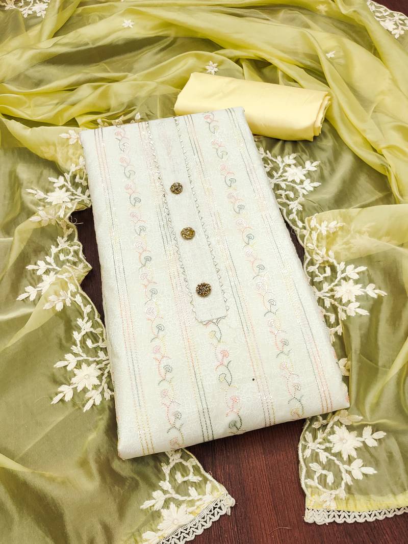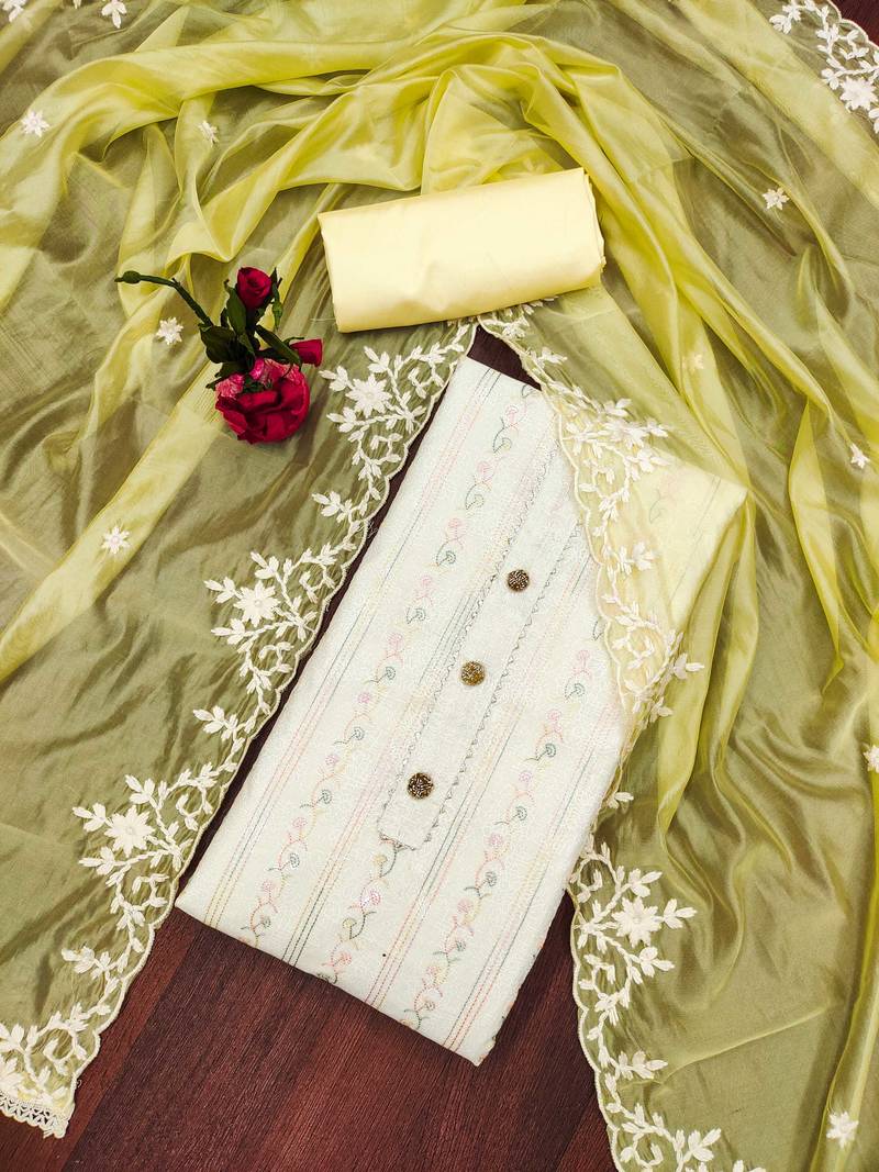 Off-white embroidered chanderi semi stitched churidar dress-materials