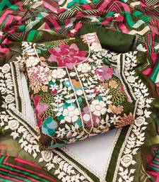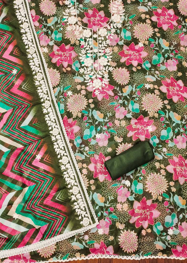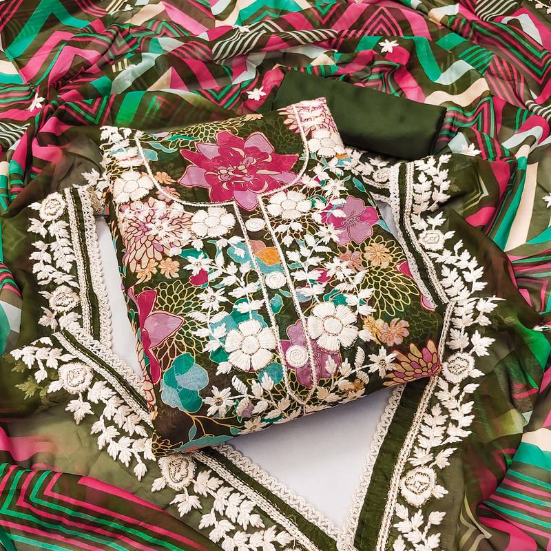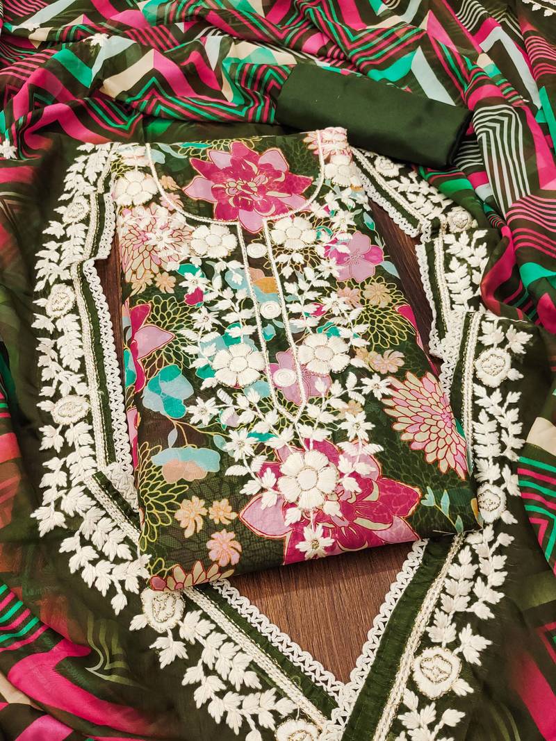 Olive green color embroidered heavy organza straight churidar dress material semi stitched