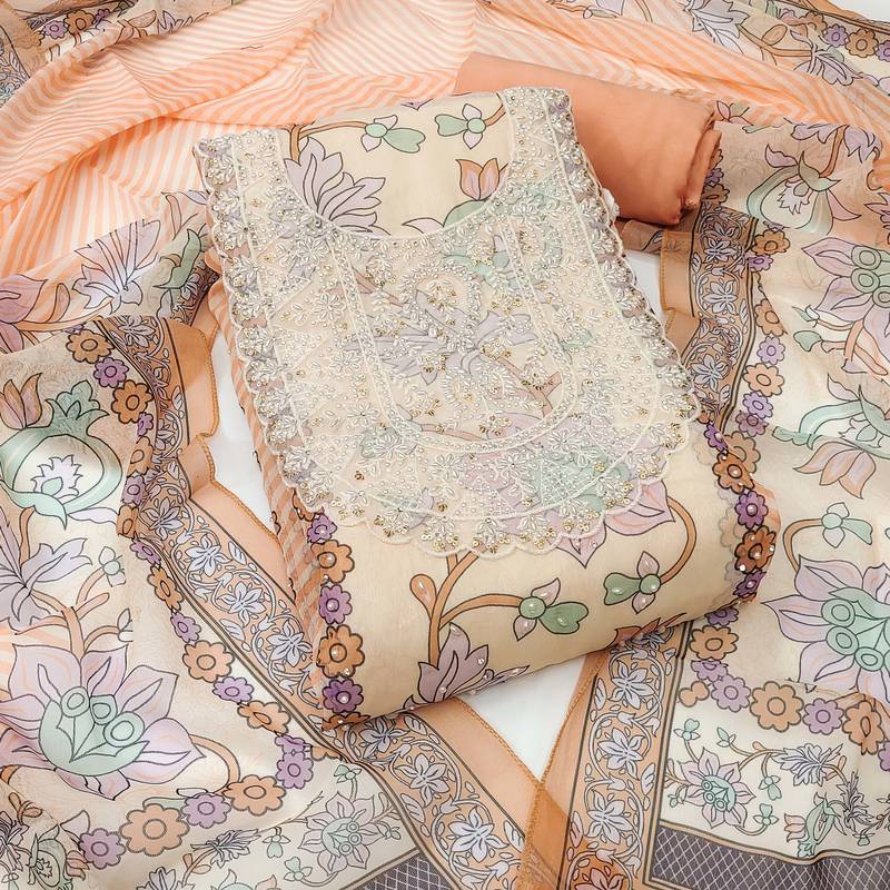 | Product Name | Orange Color Embellished Heavy Organza Straight Churidar Dress Material | |