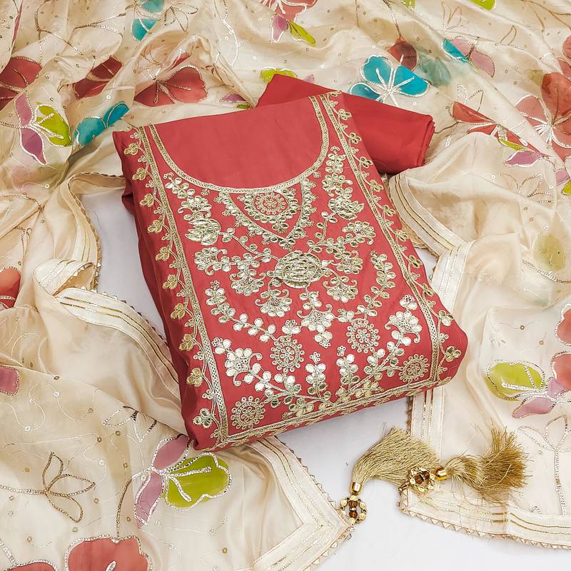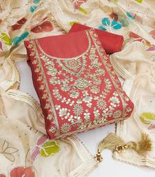 Peach color embroidered heavy roman silk straight churidar dress material semi stitched