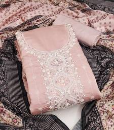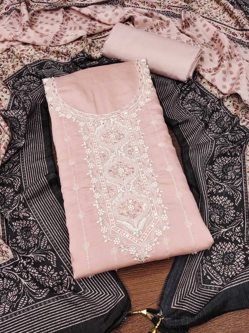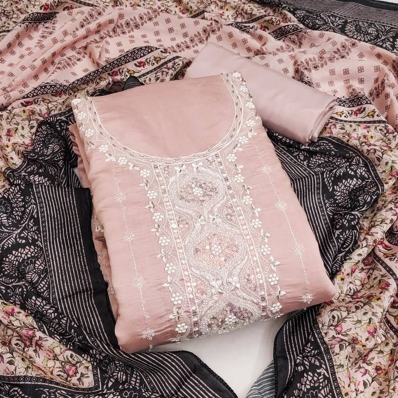 Peach color sequence heavy roman silk straight churidar dress material semi stitched