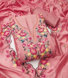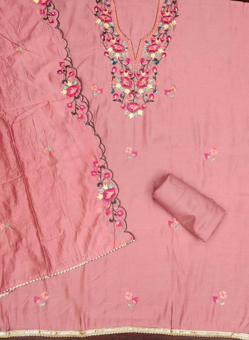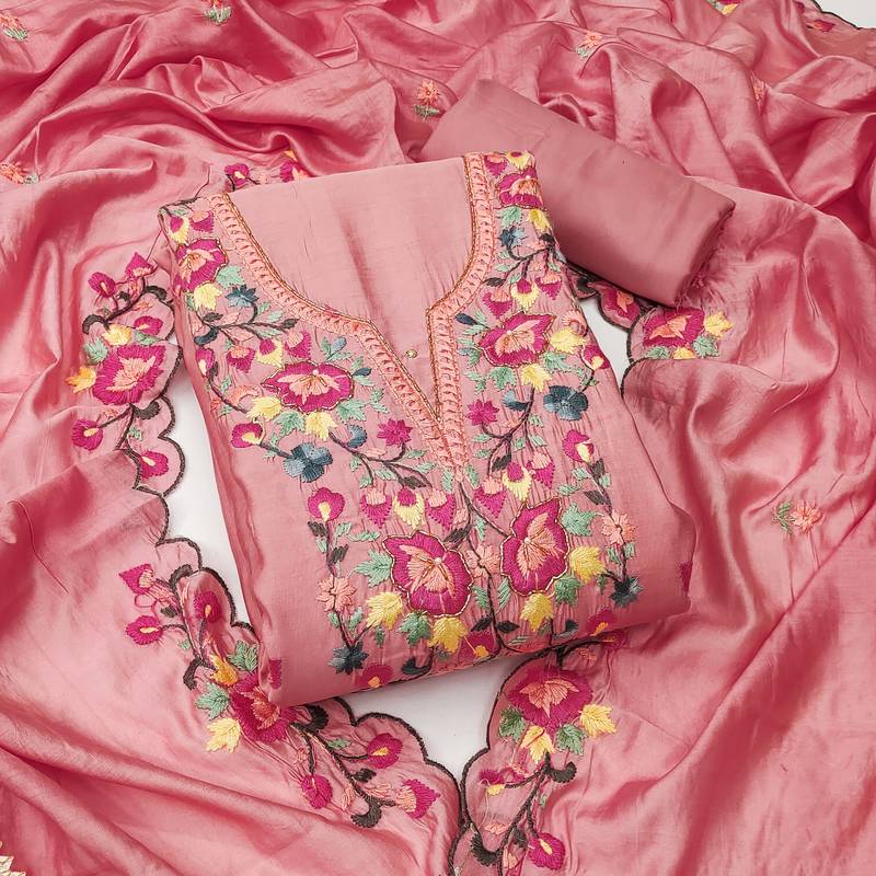 Peach color thread work roman silk straight churidar dress material semi stitched