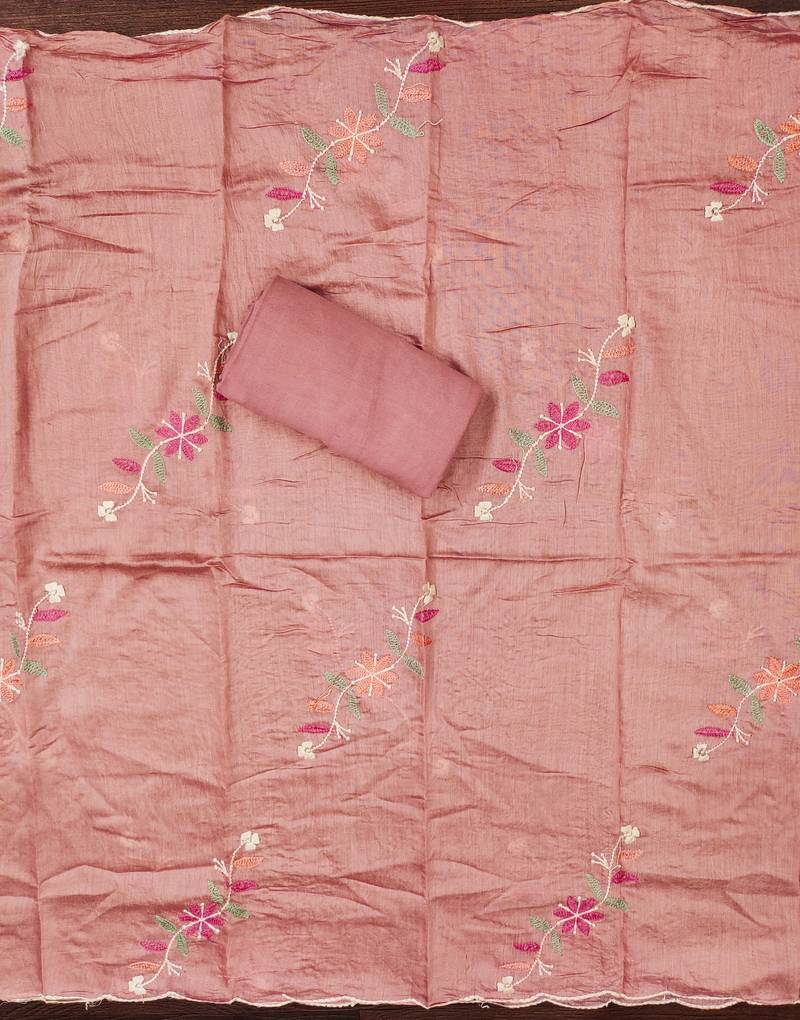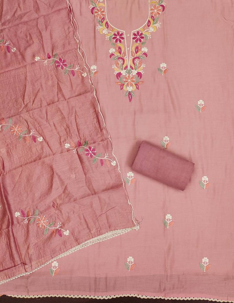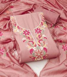 Peach color thread work roman silk straight churidar dress material semi stitched