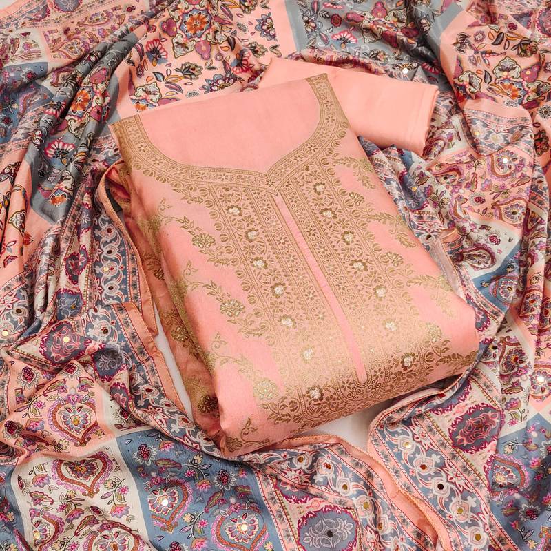 Peach color weaving banarasi jacquard straight churidar dress material semi stitched