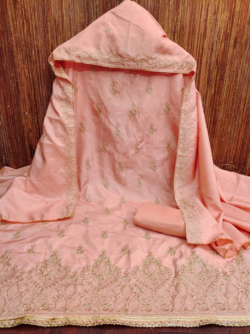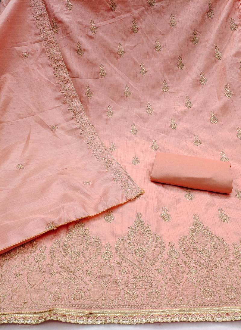Fancy Heavy Thread Zari Embrodiery And Fancy Border With Embroidered Dupatta Work Straight Style 1.90 Mtr Unstitched Dress Material Top Of Peach Colour Jalpari Cotton Fabric Also Including 2.00 Mtr Chudidar Style Bottom Piece Material Of Peach Colour Creap Fabric With 2.10 Mtr Dupatta Of Peach Colour Jalpari Cotton Fabric By Shadow & Saining Brand