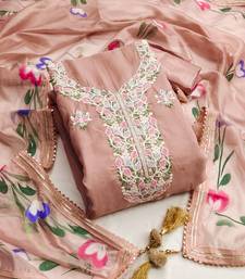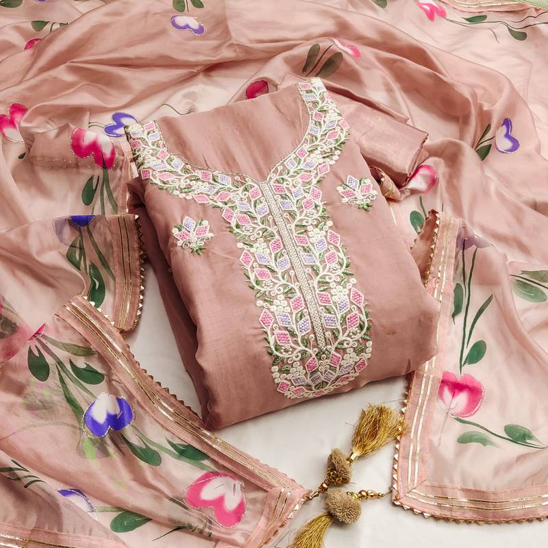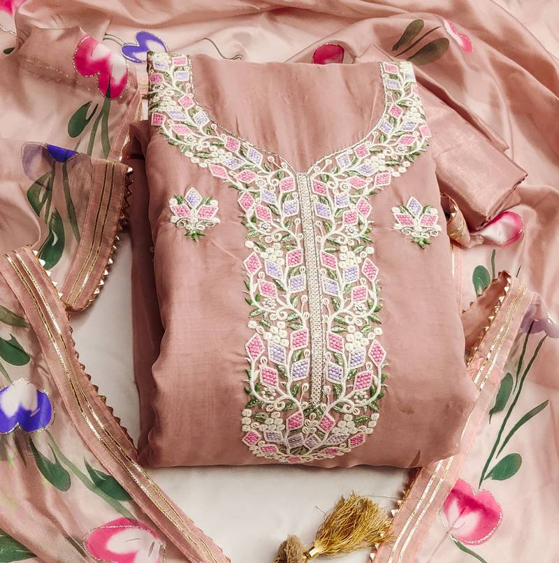 Pink color embroidered heavy organza straight churidar dress material semi stitched