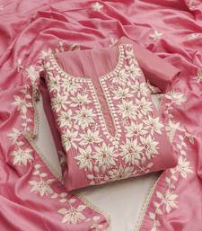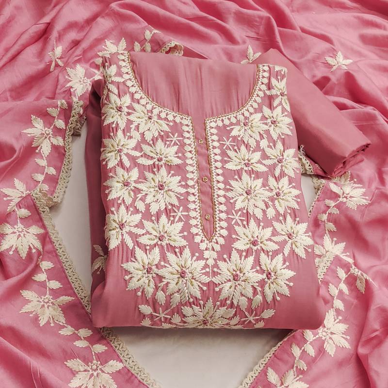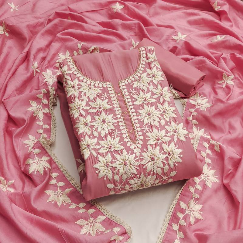 Pink color thread work roman silk straight churidar dress material semi stitched
