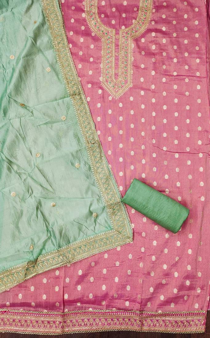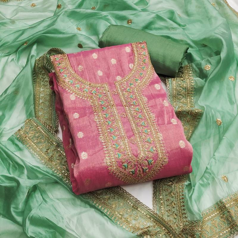 | Product Description | Designer Jari Weaving Work With Fancy Embroidery Work And Heavy Embroidery With Stylish Border Dupatta Work Straight Style 2.40 Mtr Unstitched Dress Material Top Of Pink Colour Simmer Silk Fabric Also Including 2.50 Mtr Chudidar Style Bottom Piece Material Of Green Colour Reyon Fabric With 2.40 Mtr Dupatta Of Sea Green Colour Heavy Organza Fabric By Shadow & Saining Brand |