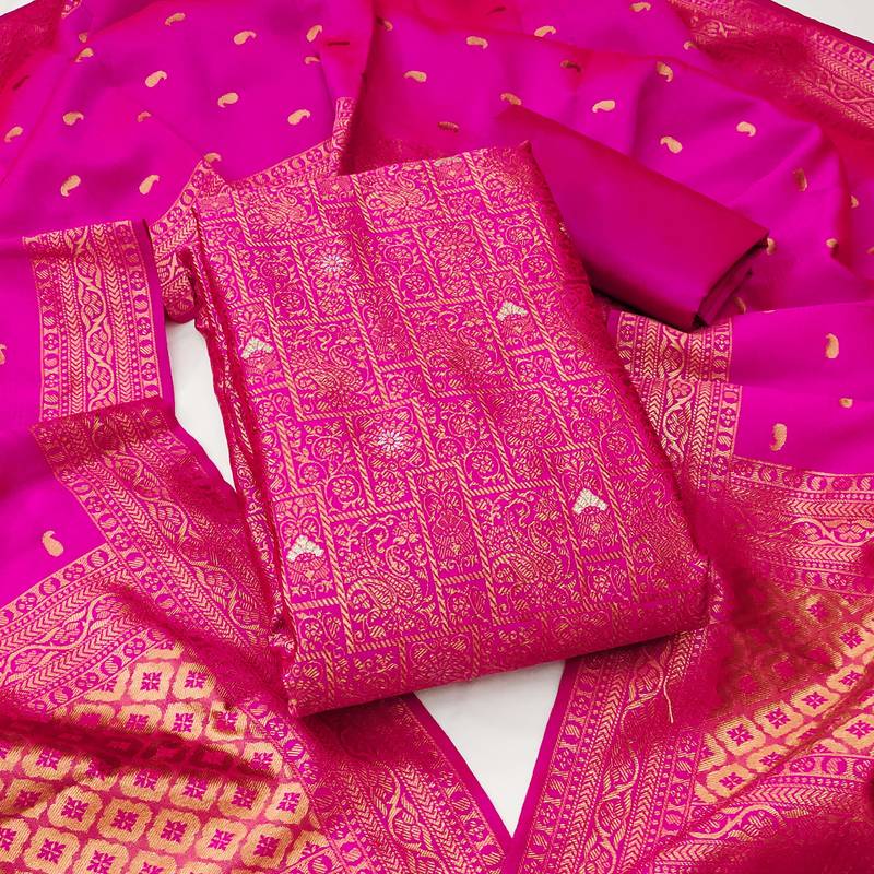 | Product Description | Dashing Heavy Weaving Work With Mina Work And Jacquard Work Dupatta Straight Style 2.40 Mtr Unstitched Dress Material Top Of Pink Colour Jacquard Silk Fabric Also Including 2.00 Mtr Chudidar Style Bottom Piece Material Of Pink Colour Silk Blend Fabric With 2.25 Mtr Dupatta Of Pink Colour Banarasi Jacquard Fabric By Shadow & Saining Brand |