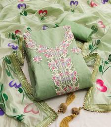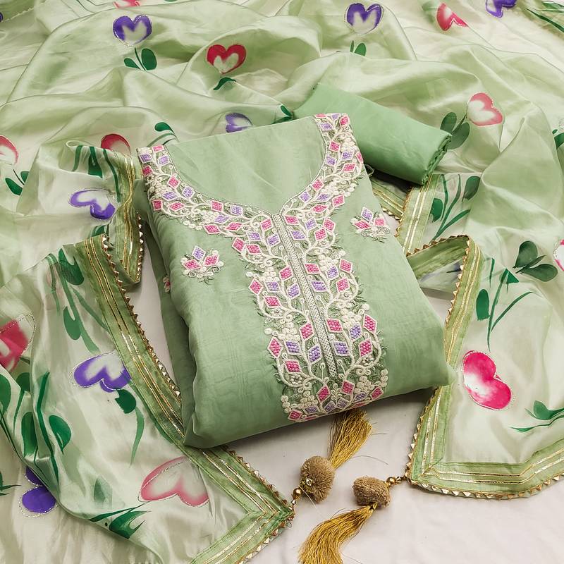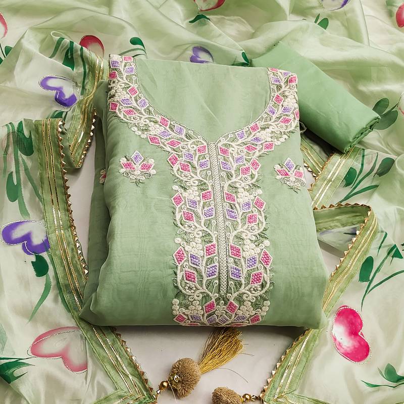 Pista green color embroidered heavy organza straight churidar dress material semi stitched