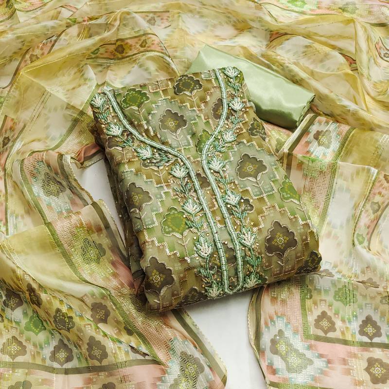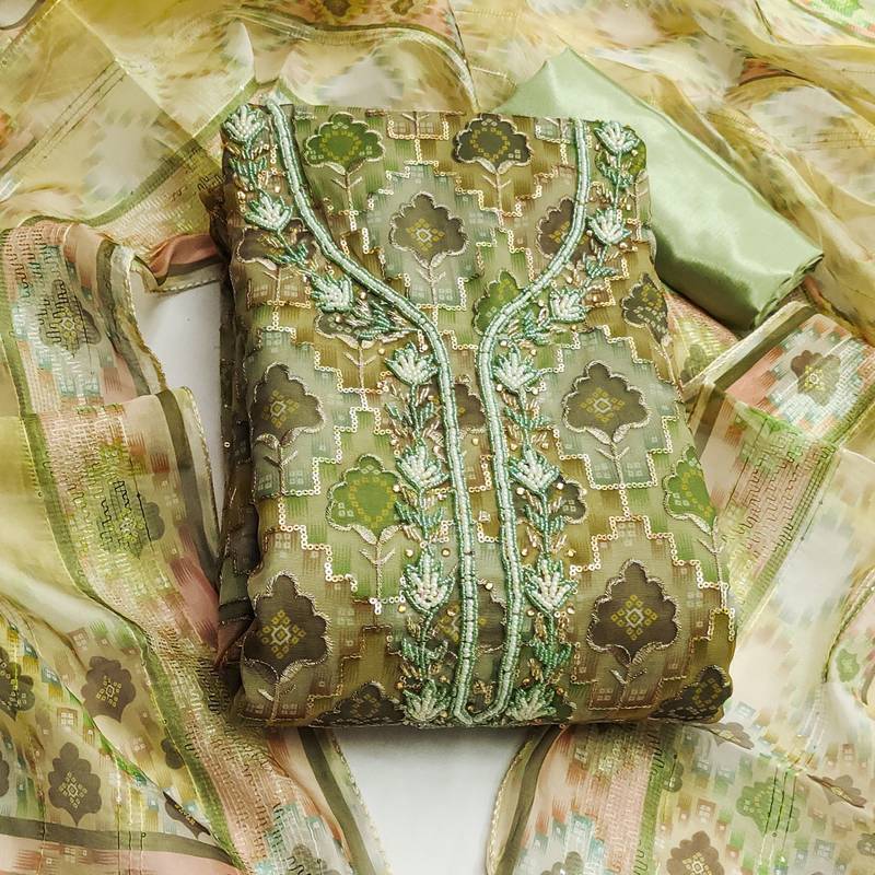 | Product Description | Stylish Stylish Sequence Work With Designer Position Print And Hand Work With Heavy Embroidered Dupatta Work Straight Style 1.90 Mtr Unstitched Dress Material Top Of Pista Green Colour Heavy Organja Fabric With 2 Mtr Heavy Santoon As Lining Inner Fabric Also Including 3.60 Mtr Unstiched Bottom Material Of Pista Green Colour Heavy Santoon Fabric With 2.15 Mtr Dupatta Of Multi Colour Heavy Organja Fabric By Shadow & Saining Brand |
