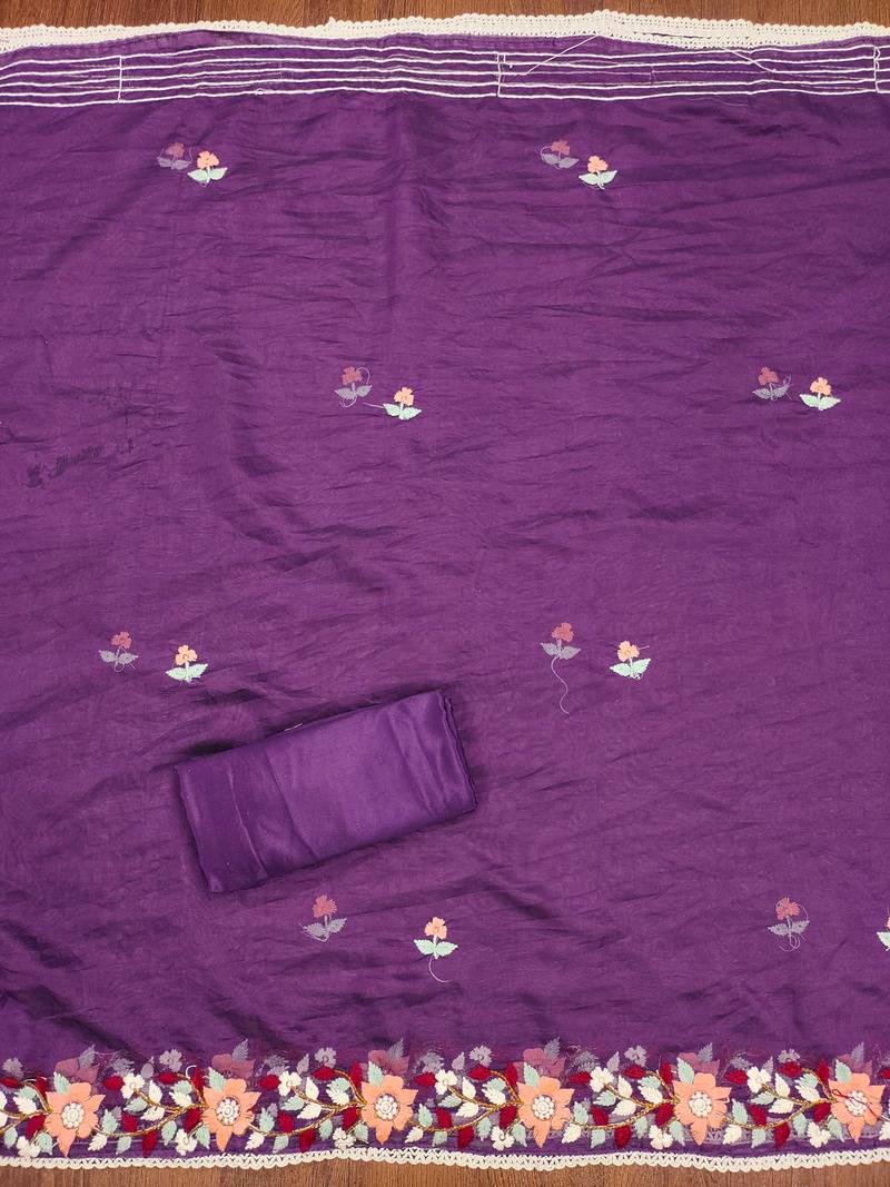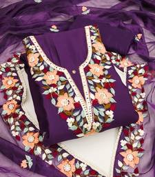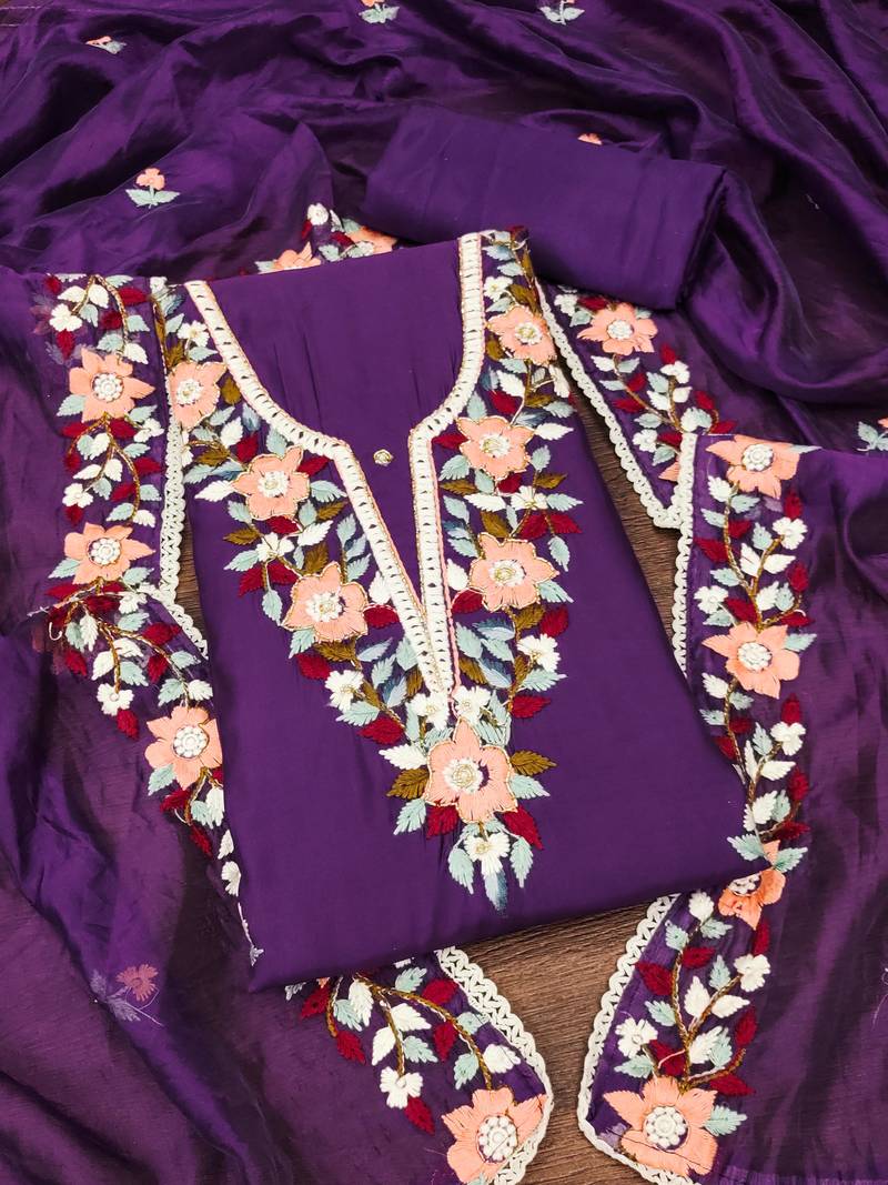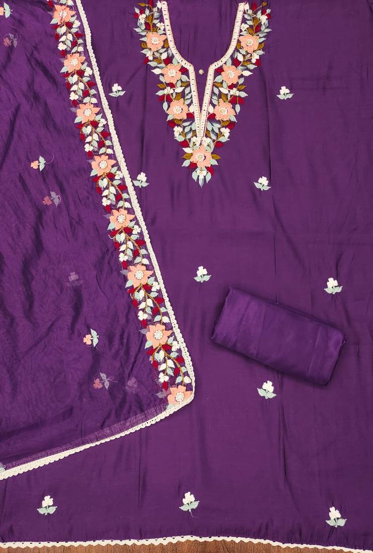 Purple color thread work heavy roman silk straight churidar dress material semi stitched