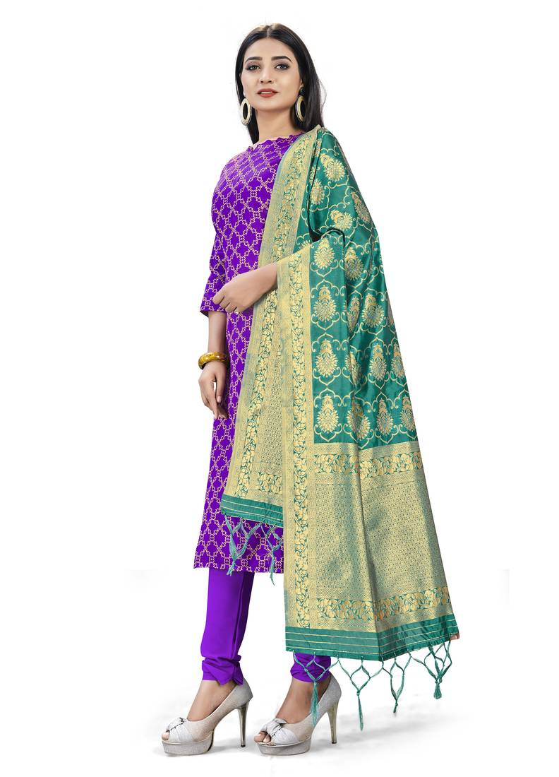 | Product Description | Beautifull Fancy Designer All Over Weaving Work Top And Sleeves With Fancy Stall Dupatta Of Weaving And Jalar Work Straight Style 2 Mtr Unstitched Dress Material Top Of Purple Colour Banarasi Silk Fabric Suggestable Quarter Style Sleeves And Round Style Neck Also Including 2.30 Mtr Chudidar Style Bottom Piece Material Of Purple Colour Silk Blend Fabric With 2.25 Mtr Dupatta Of Green Colour Banarasi Silk Fabric By Shadow & Saining Brand |