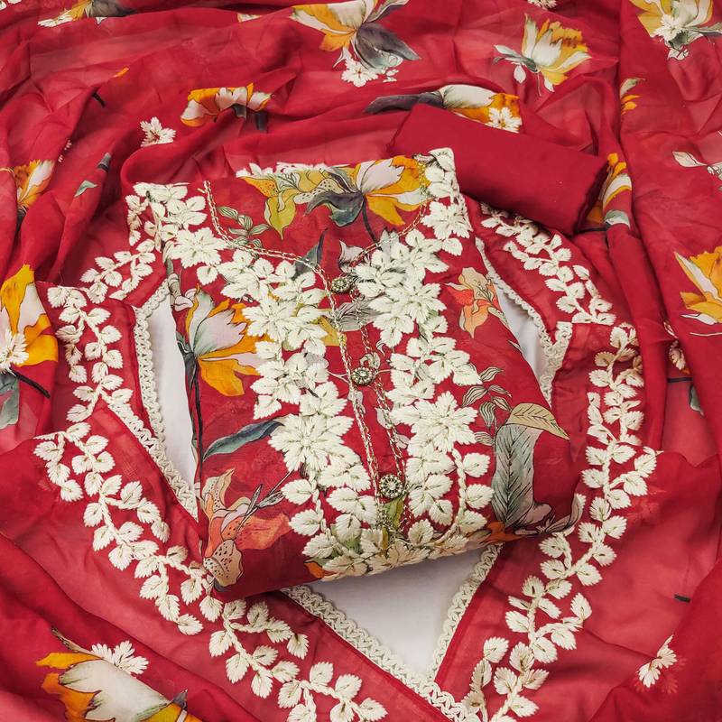 Red color embroidered heavy organza straight churidar dress material semi stitched