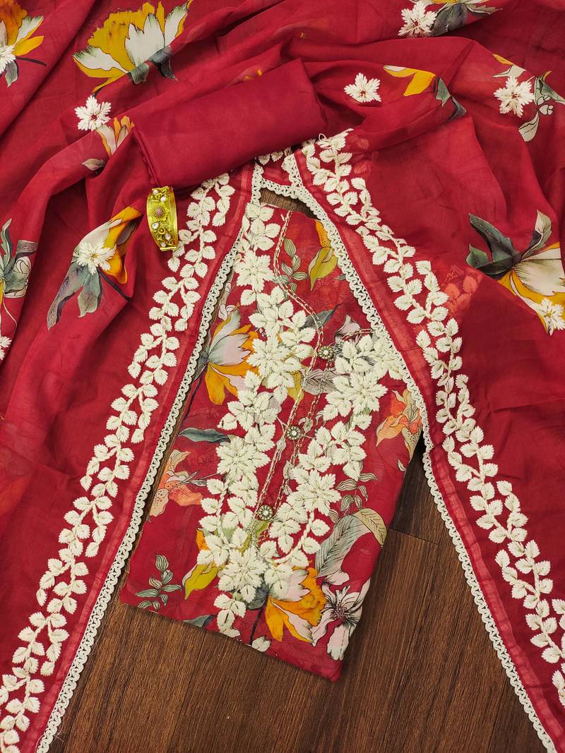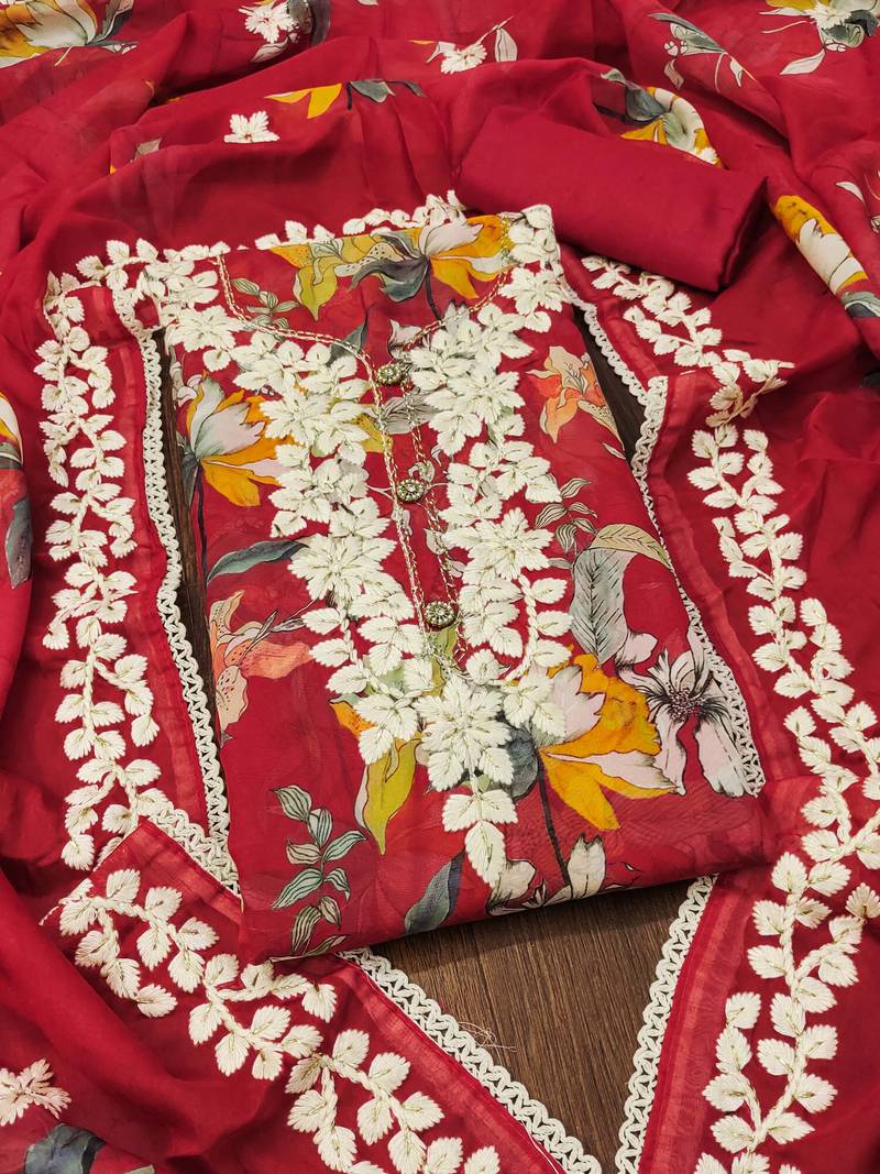 | Product Name | Red Embroidered Organza Semi Stitched Churidar Dress Materials | |