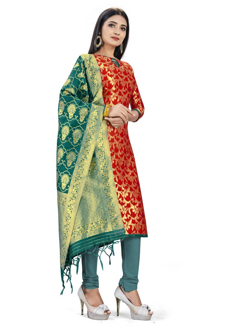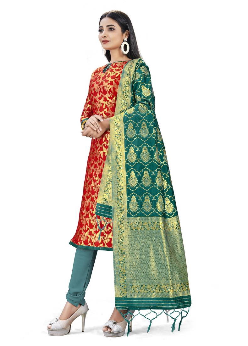 | Product Description | Stylish Heavy Designer All Over Jall Pattern Weaving Work Top With Fancy Stall Dupatta Of Weaving And Jalar Work Straight Style 2 Mtr Unstitched Dress Material Top Of Red Colour Banarasi Silk Fabric Suggestable Quarter Style Sleeves And Round Style Neck Also Including 2.30 Mtr Chudidar Style Bottom Piece Material Of Green Colour Silk Blend Fabric With 2.25 Mtr Dupatta Of Green Colour Banarasi Silk Fabric By Shadow & Saining Brand |