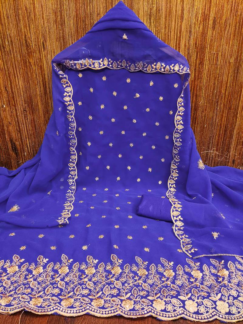 Opulent Heavy Thread Embroidery And Fancy Border With Embroidered Dupatta Straight Style 2.00 Mtr Unstitched Dress Material Top Of Royal Blue Colour Georgette Fabric With 2 Mtr Santoon As Lining Inner Fabric Also Including 3.60 Mtr Unstiched Bottom Material Of Royal Blue Colour Santoon Fabric With 2.00 Mtr Dupatta Of Royal Blue Colour Georgette Fabric By Shadow & Saining Brand