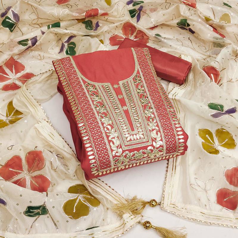 | Product Description | Designer Heavy Embroidery Work Top With Fancy Sequence And Digital Print Dupatta Work Straight Style 2.20 Mtr Unstitched Dress Material Top Of Rust Colour Heavy Roman Silk Fabric Also Including 2.40 Mtr Chudidar Style Bottom Piece Material Of Rust Colour Heavy Santoon Fabric With 2.20 Mtr Dupatta Of Cream Colour Heavy Organza Fabric By Shadow & Saining Brand |