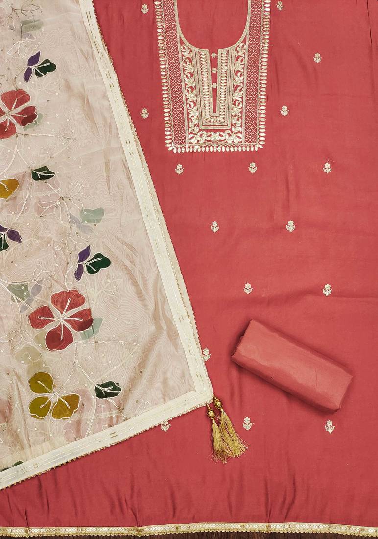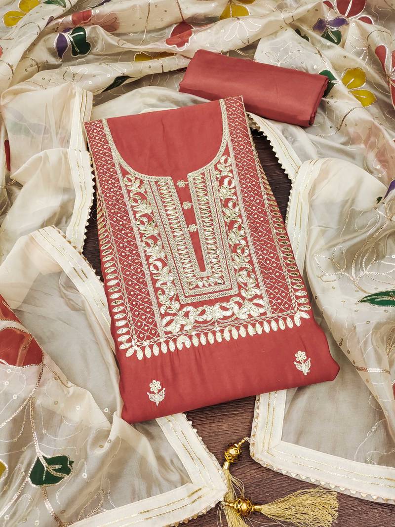 Rust color embroidered heavy roman silk straight churidar dress material semi stitched
