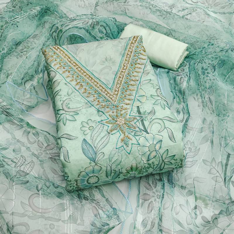 | Product Description | Stylish Thread Work With Designer Position Print And Hand Work With Fancy Sequence And Digital Print Dupatta Work Straight Style 2.00 Mtr Unstitched Dress Material Top Of Sea Green Colour Heavy Organza Fabric With 2 Mtr Heavy Santoon As Lining Inner Fabric Also Including 4.00 Mtr Unstiched Bottom Material Of Green Colour Heavy Santoon Fabric With 2.25 Mtr Dupatta Of Sea Green Colour Heavy Organza Fabric By Shadow & Saining Brand |
