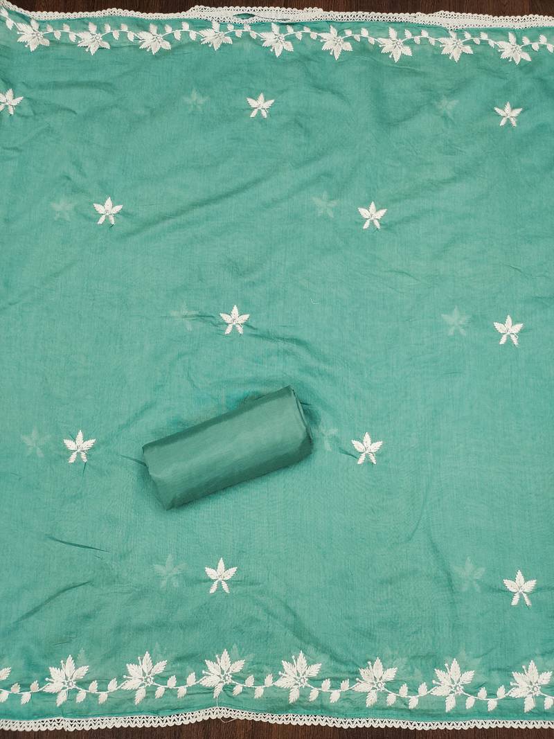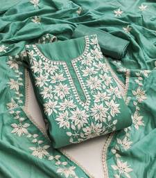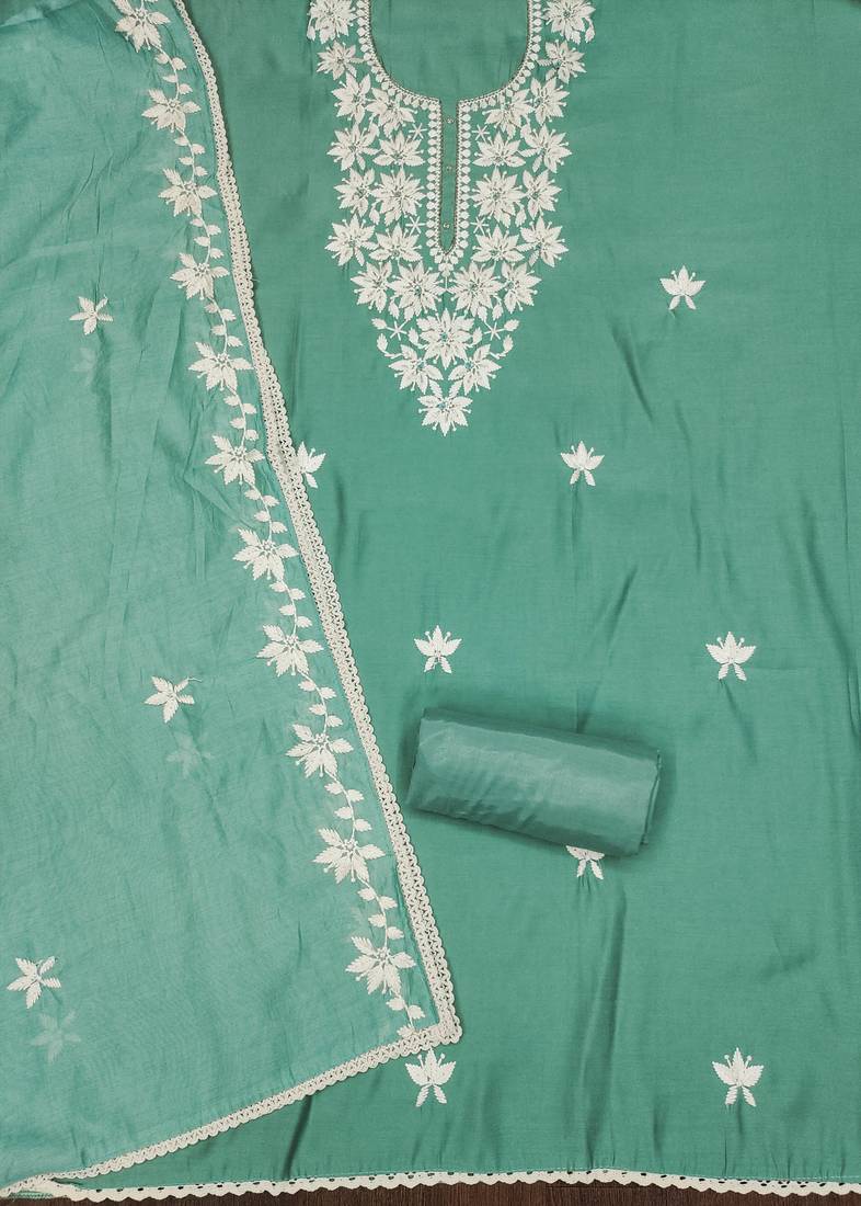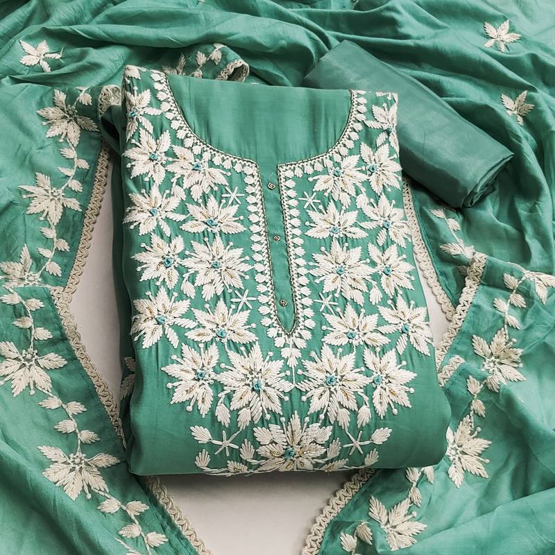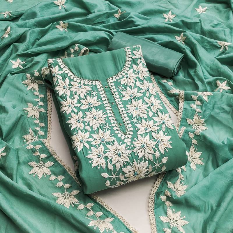 Sea green color thread work roman silk straight churidar dress material semi stitched