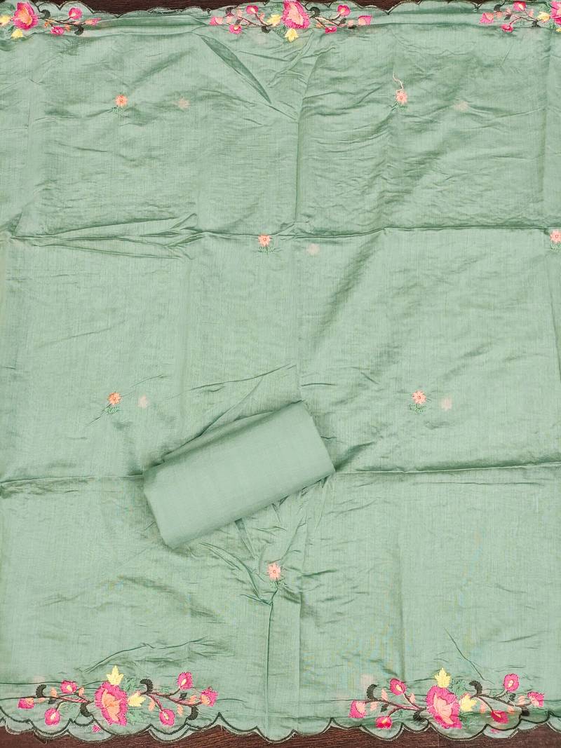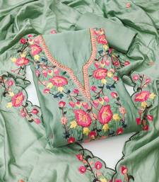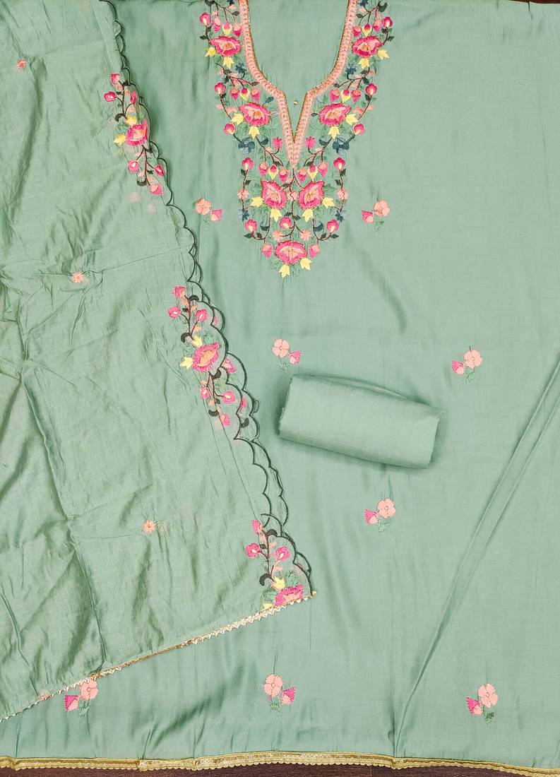 Sea green color thread work roman silk straight churidar dress material semi stitched
