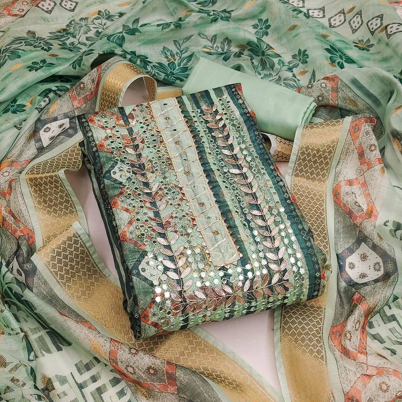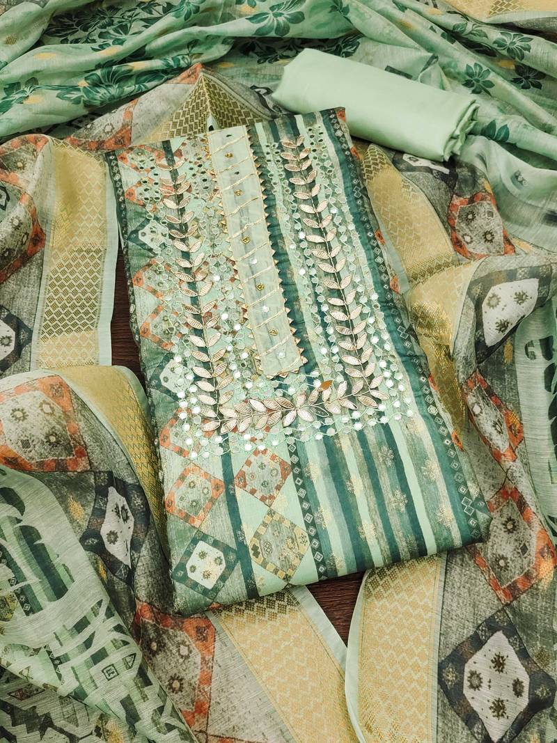 | Product Description | Fancy Designer Jari Weaving Work With Fancy Neck Work And Fancy Jari Weaving Work Dupatta Straight Style 1.95 Mtr Unstitched Dress Material Top Of Sea Green Colour Banarasi Jacquard Fabric With 2 Mtr Heavy Santoon As Lining Inner Fabric Also Including 3.70 Mtr Unstiched Bottom Material Of Sea Green Colour Heavy Santoon Fabric With 2.25 Mtr Dupatta Of Multi Colour Cotton Jacquard Fabric By Shadow & Saining Brand |