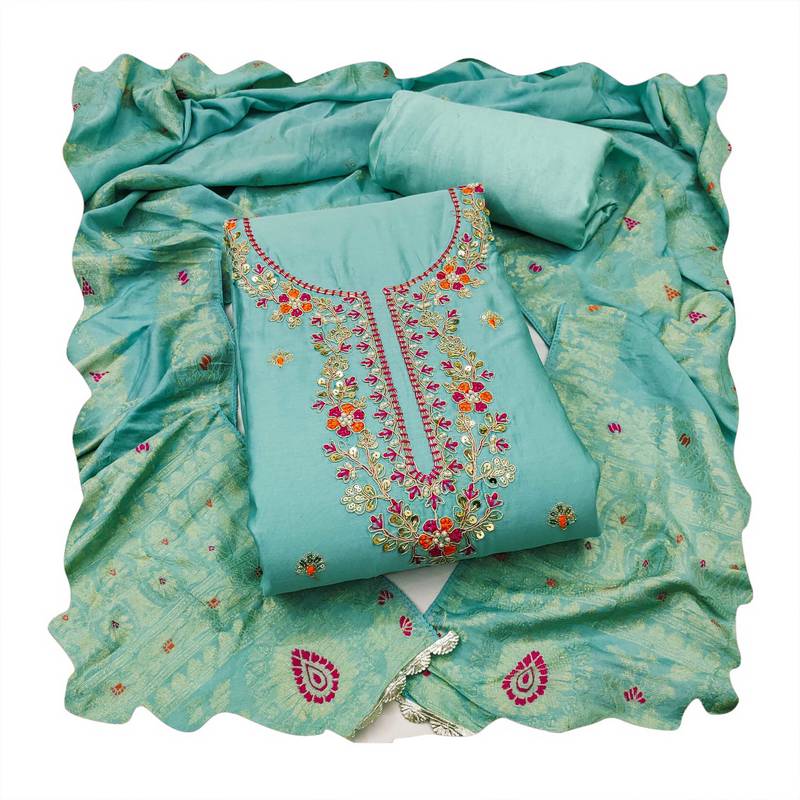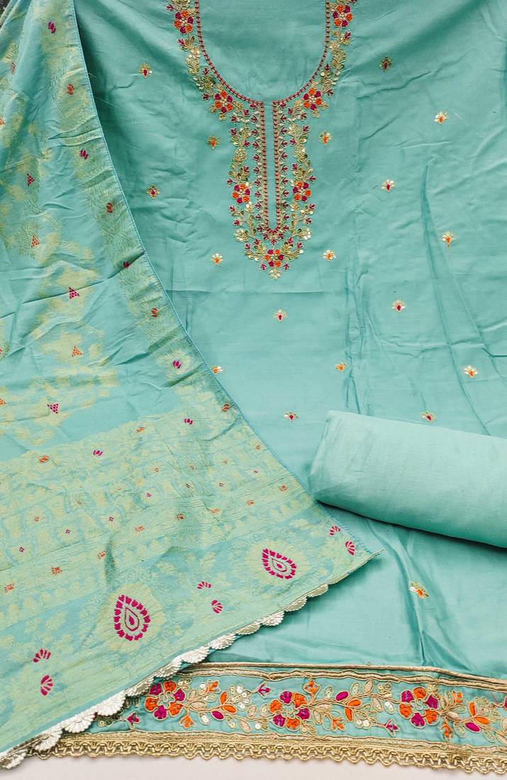 | Product Description | Wedding Perfect Heavy Handwork And Fancy Border With Designer Woven Dupatta Straight Style 2.00 Mtr Unstitched Dress Material Top Of Sea Green Colour Jaam Cotton Fabric Also Including 2.40 Mtr Chudidar Style Bottom Piece Material Of Sea Green Colour Rayon Fabric With 2.10 Mtr Dupatta Of Sea Green Colour Muslin Banarasi Fabric By Shadow & Saining Brand |
