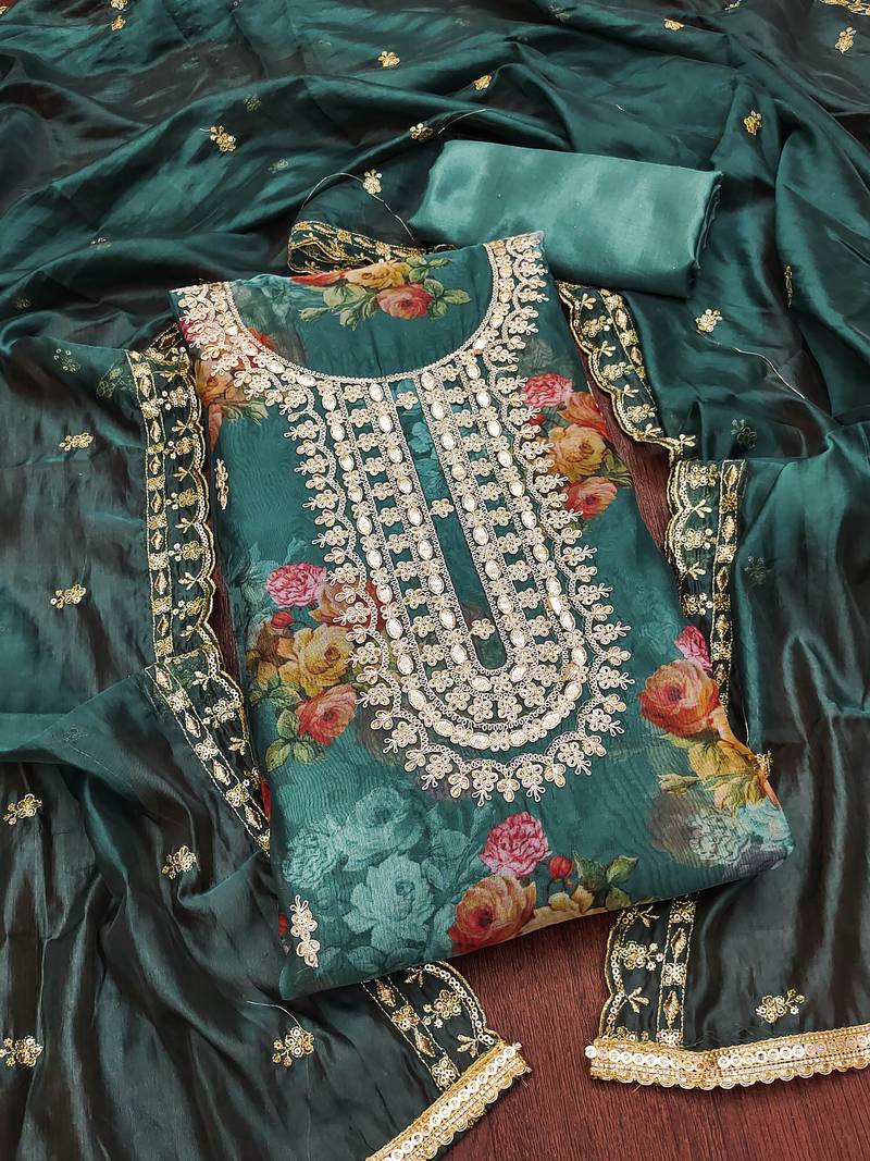 Sea-green hand embroidery organza semi stitched churidar dress-materials